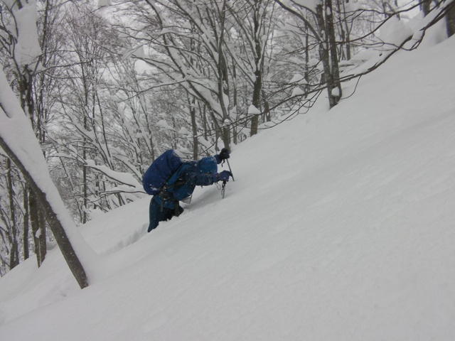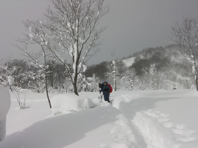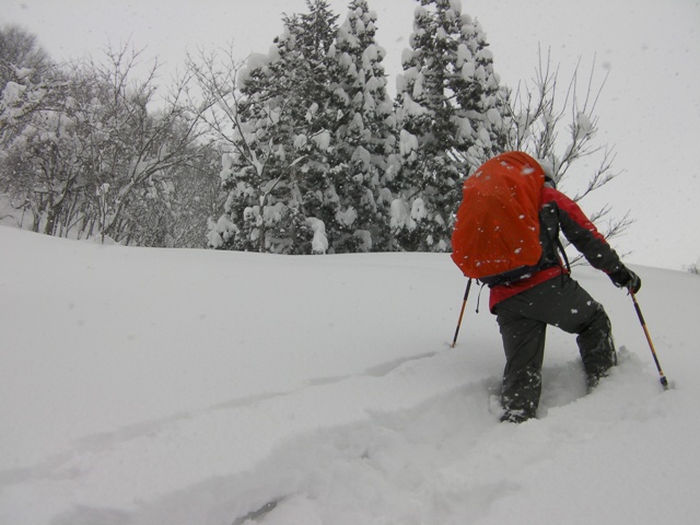 気合の余った会長は,トレースから外れ雪靴でラッセルする.