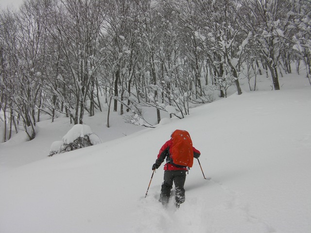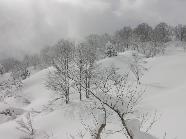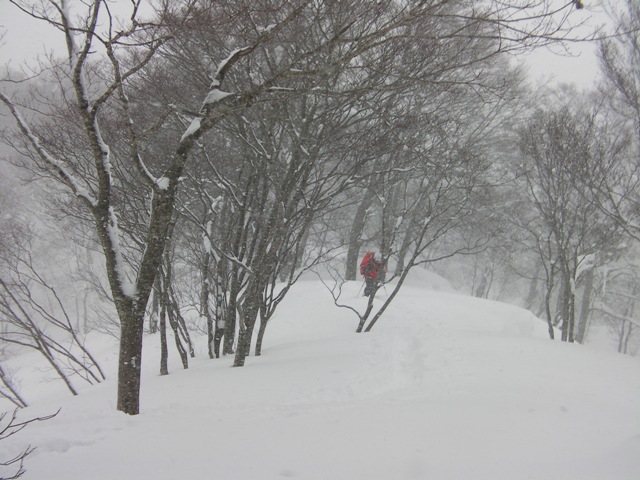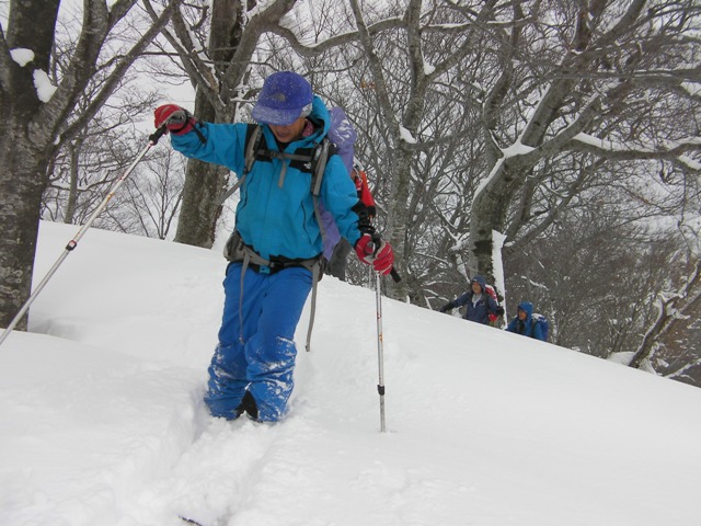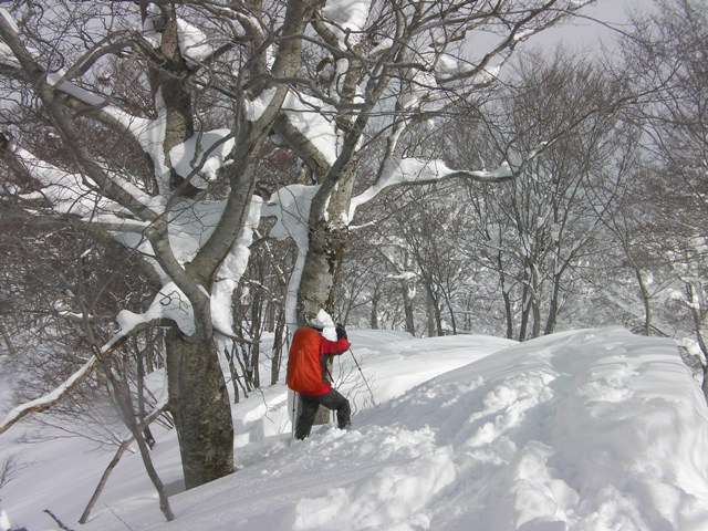 その稜線尾根に出ても風がそれほど無いせいか雪が締まっておらず,結構ふかふかだ.