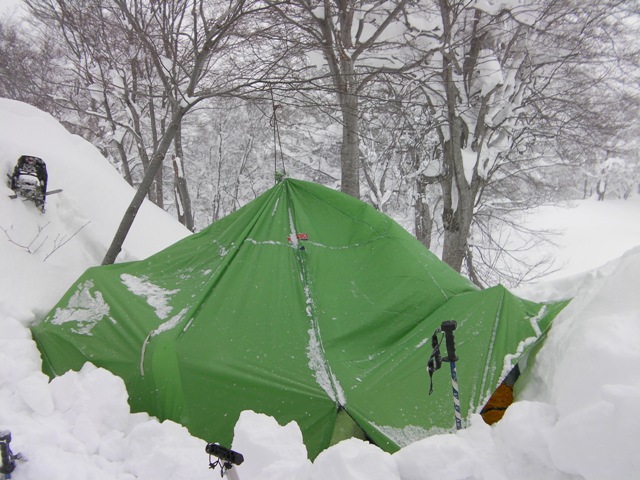 今回の設営場所は斜めになっていて,少々隙間ができてしまい1級フライ設営士の会長はどうも納得がいかなかったようであるが,ストーブを点火すればぬくぬく快適空間が広がる.