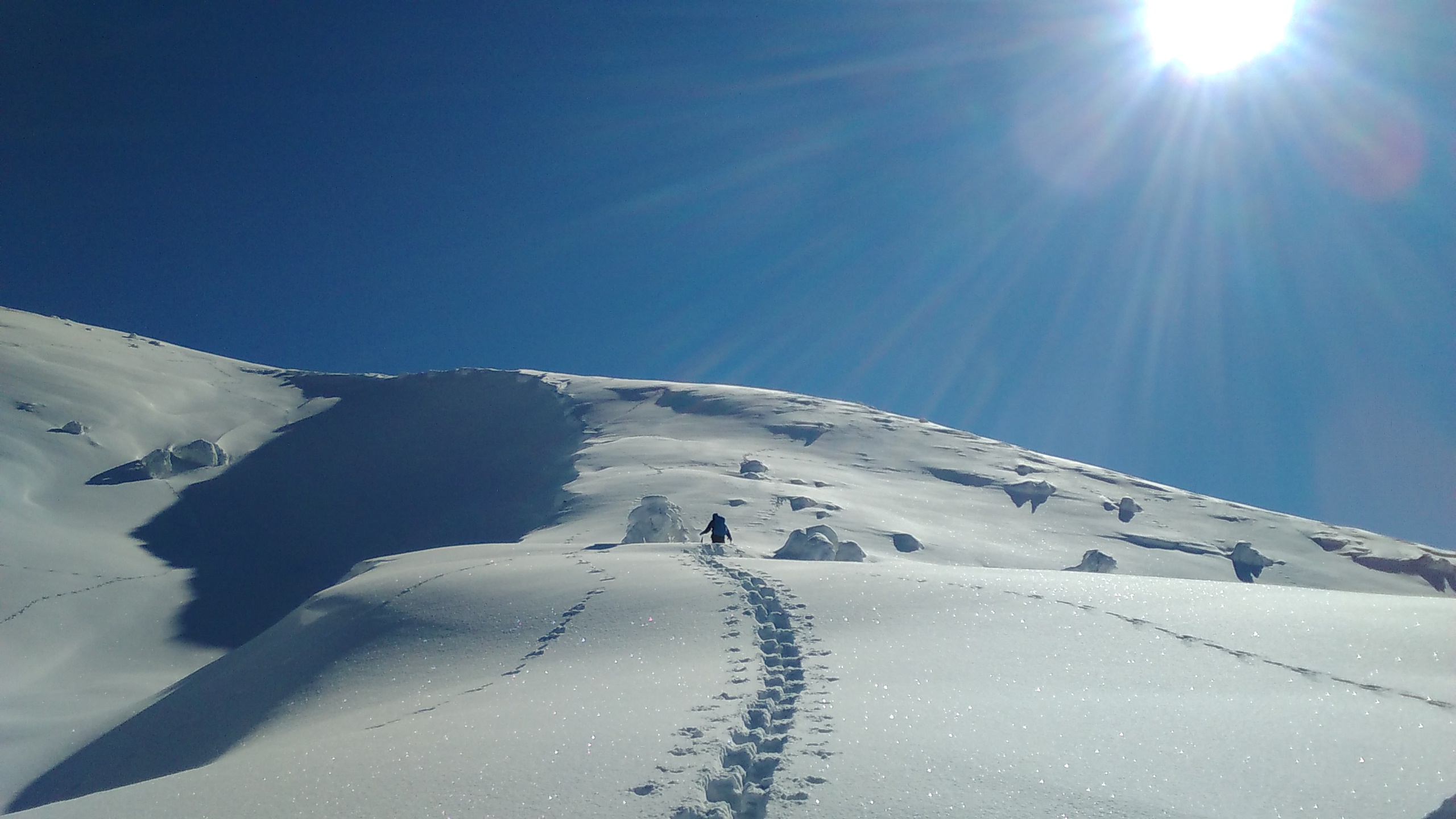 今シーズン初めての大きな高気圧の到来で文句なしの快晴となった。今日はラッセルが深かろうが必ず頂上へ行きたいので南俣を未明に出発する。