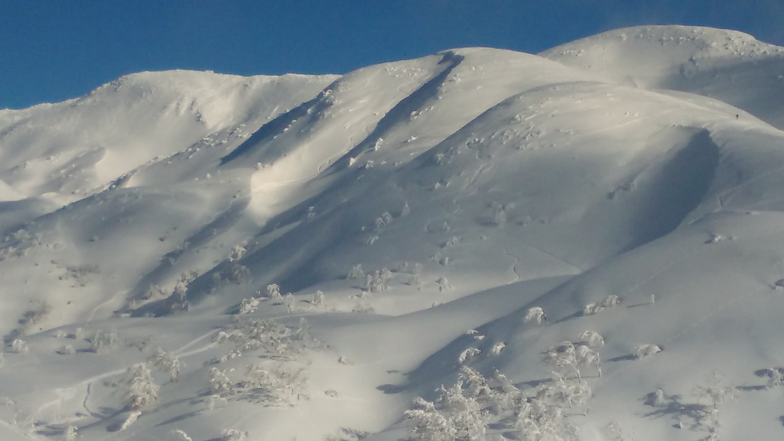 神社から杉林を抜け登るにつれ新雪をかぶった森が美しい、昨日のトレースが独標まであり大変に助かった。しかし乾いた新雪でシールの効きが悪く体力を消耗した。六合目の油こぼしへ向かう稜線から頂上稜線の眺めは何度来ても感動する。帰路、今日は気温も上がらず、ダイヤモンドのように光る新雪を気持ちよく滑降した。