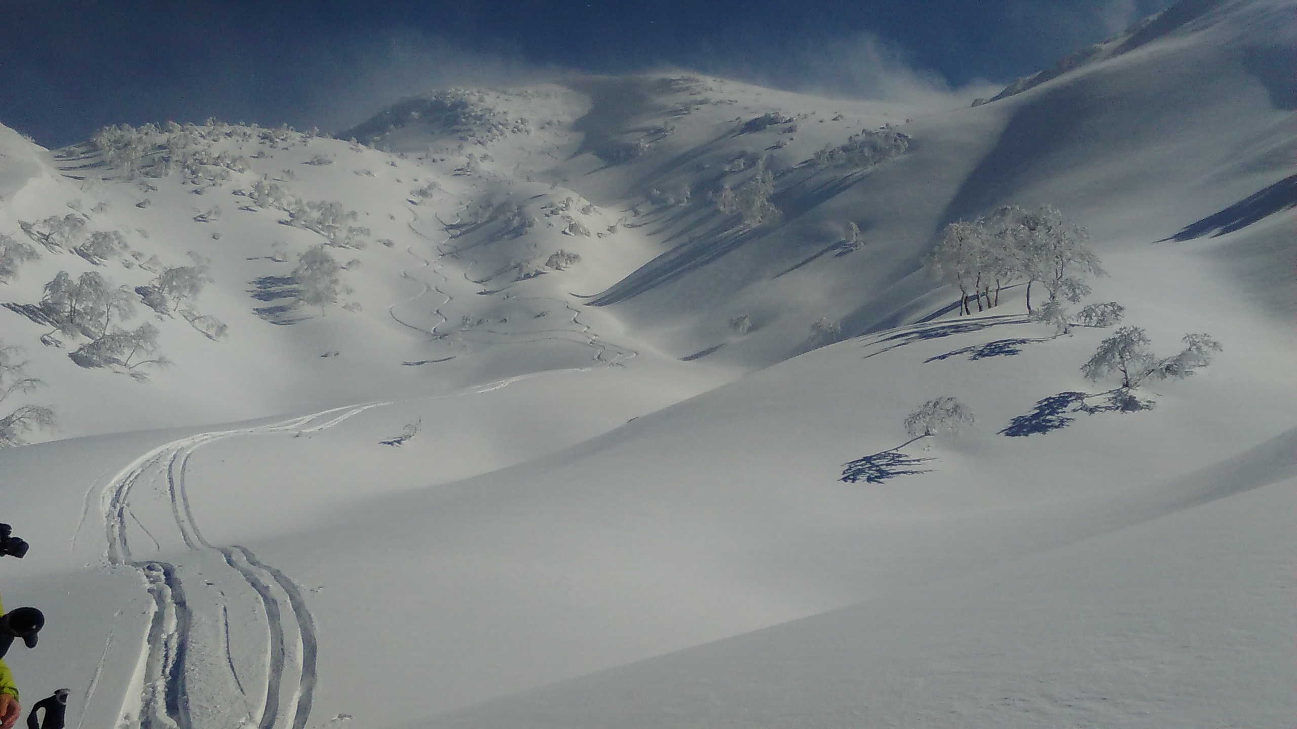 滑りなれた何時ものパウダーゾーンは今日も快適であった。救助隊のジェットも飛来し我々の上空を何度も旋回してくれた。今日は雪温が上らず、一王子から下も北向きの斜面を選べば快適なパウダーランが出来た。