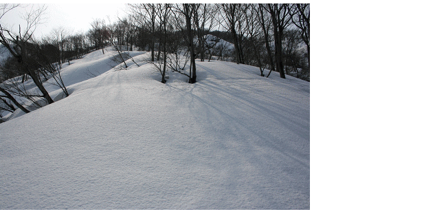 積雪期の下権現堂山は旧アクシオムスキー場から登る人がほとんどのようだが、スキー場も地面が見え始めている。今回は以前から狙っていた、低山ながら雪質がよさそうな北斜面を往復する。
