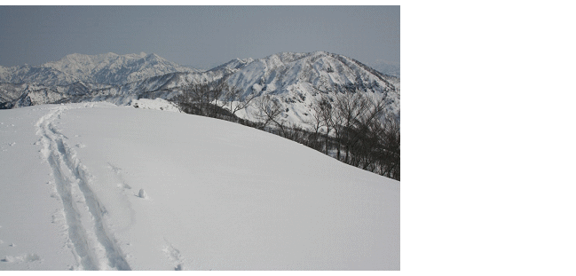 赤土集落から皿津川沿いに道なりに行き、大きな砂防ダムの下で対岸に渡ると、道はいつしかスギ林の中に消える。この先、雪が少なく1カ所スキーをはずして沢を渡るところがあった。スギ林が切れるあたりで、山頂から真北に延びる小尾根に取付く。この尾根を登りつめると東西に長い山頂の東端に出る。山頂からは360°の大展望だ。本日の下権現堂山は、旧スキー場から歩いていきた単独行との2人だけだった。