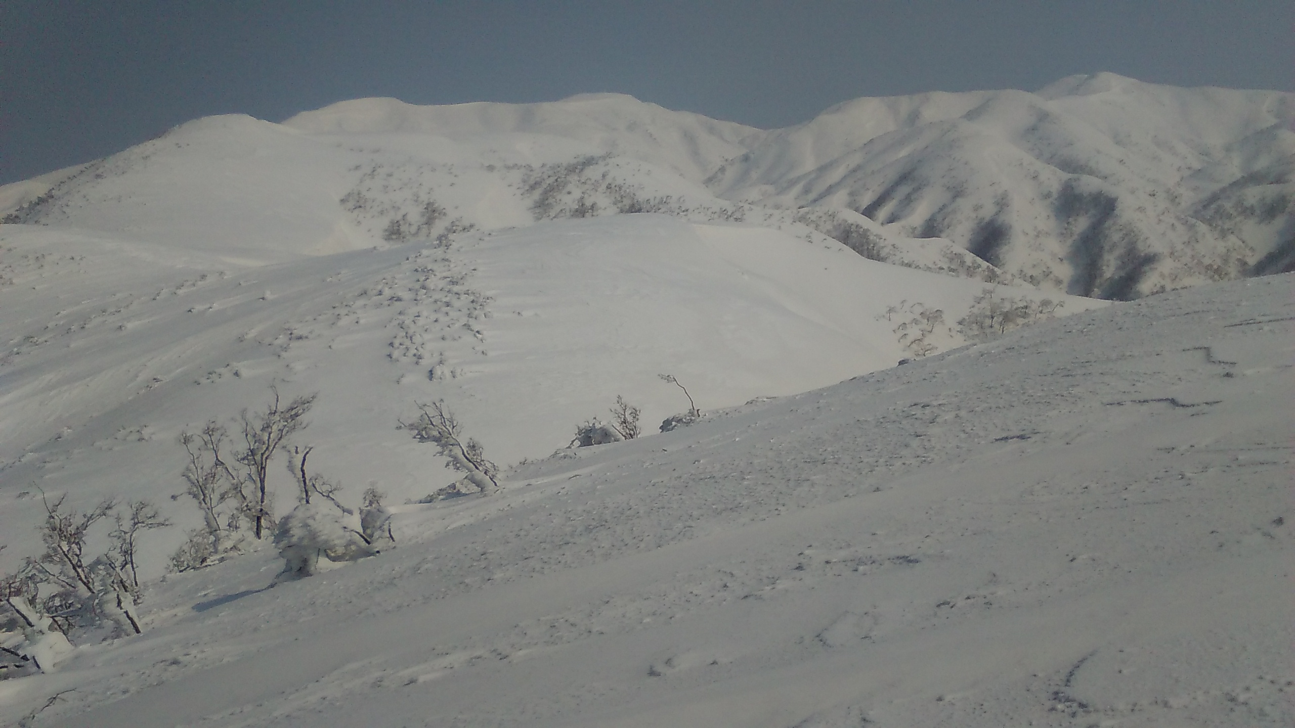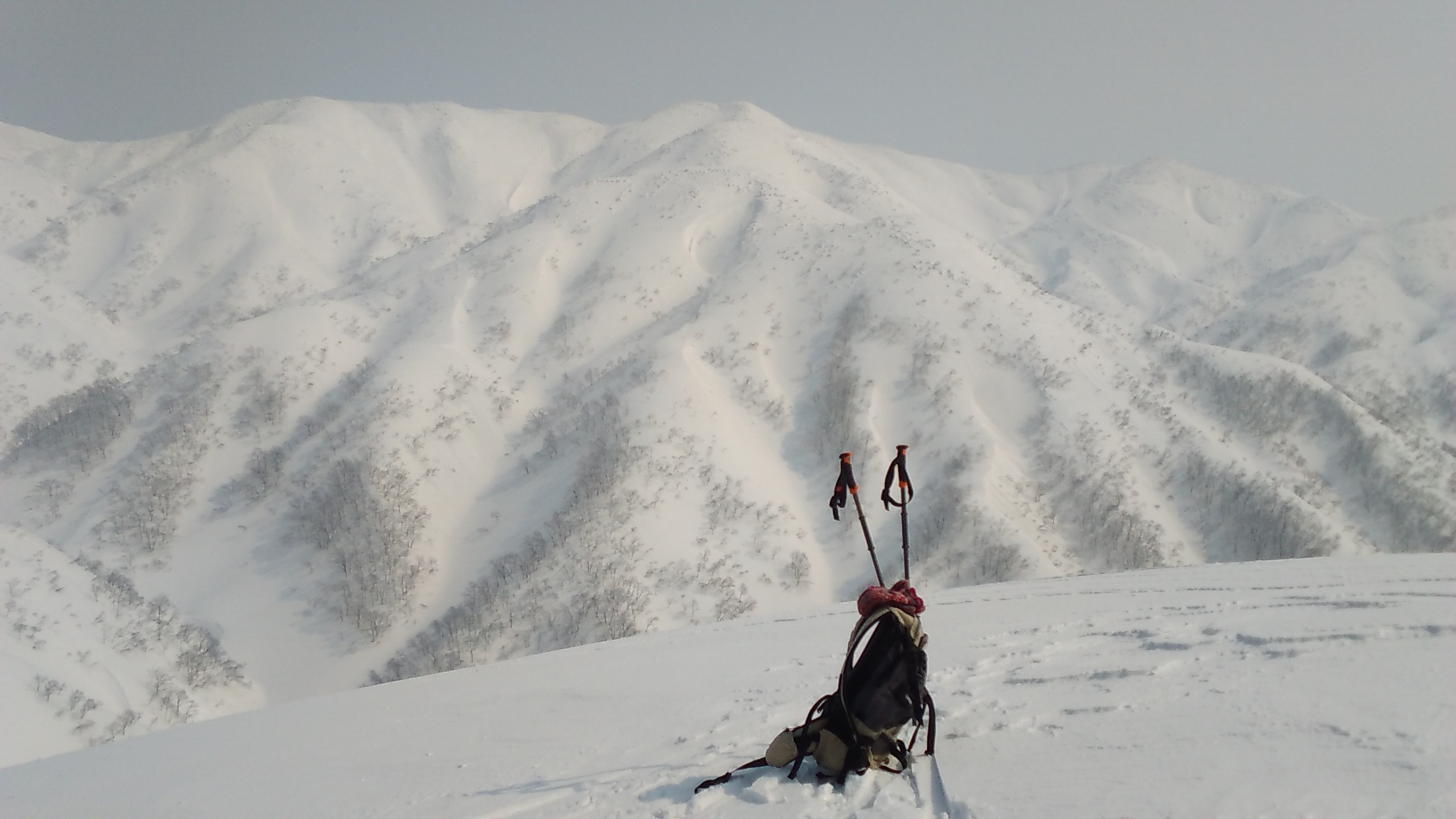 薄暗い中、南俣川にそった羽津林道をスキーで歩き出す。雪は予想以上に多くかつ良く締まっており歩きやすかった。最初の関門は尾根の取付きの急登であるが雪が多く滑らかで段差も無くシールの効きもよく順調に高知山まで上ることが出来た。今日は春のかすみでやや白っぽいが南俣川の谷をはさんで二王子岳の夏道の尾根と頂上から続く二本木山が見える。ここで防風衣をはおり場割峰へ向かう所々吹き溜まりのラッセルがあったが景色を楽しみながらの稜線漫歩であった。