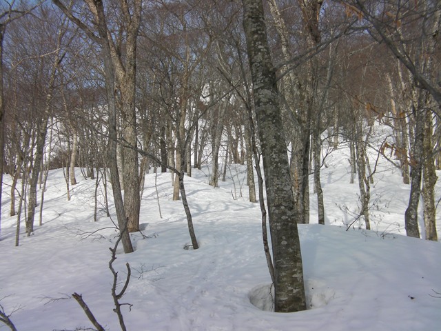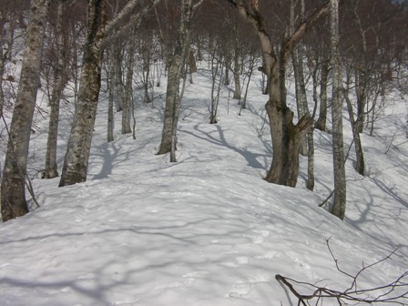 標高1270m付近でそのトレースを付けた人は,途中でつぼ足に切り替えたようだ.