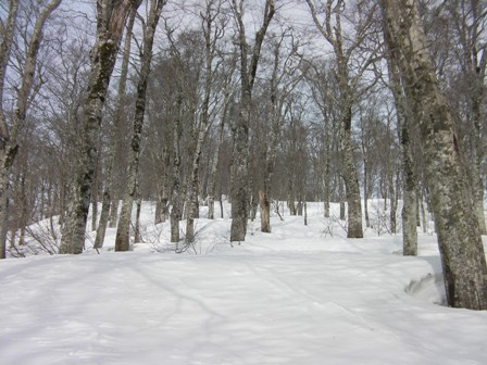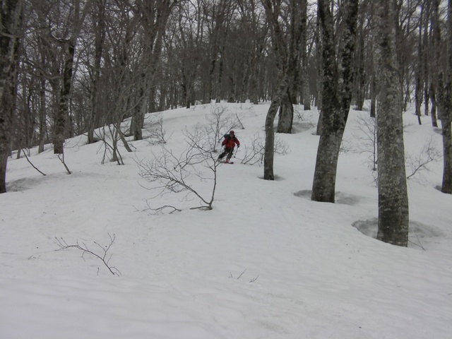 標高800mくらいから下は,少々小枝がうるさくなるが隙間を探して滑っているとすぐに国道が見えてくる.