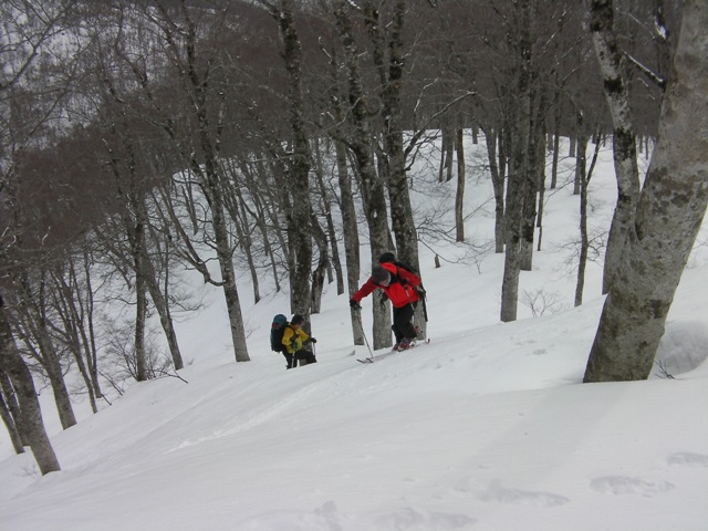 取り付きからすぐに固く締まった急斜面がお出迎えだ.