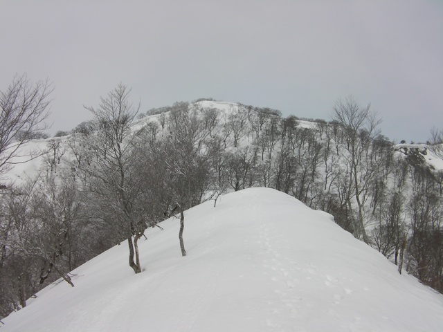 その標高点を過ぎて細尾根を行くと北側に雪庇ができている.