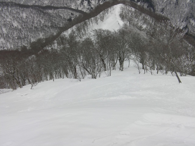 尾根に戻ったSケンさんが飛ぶように滑り下りていく.