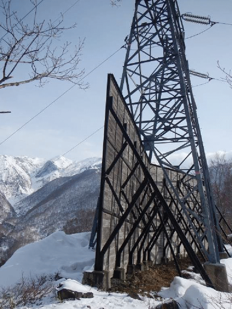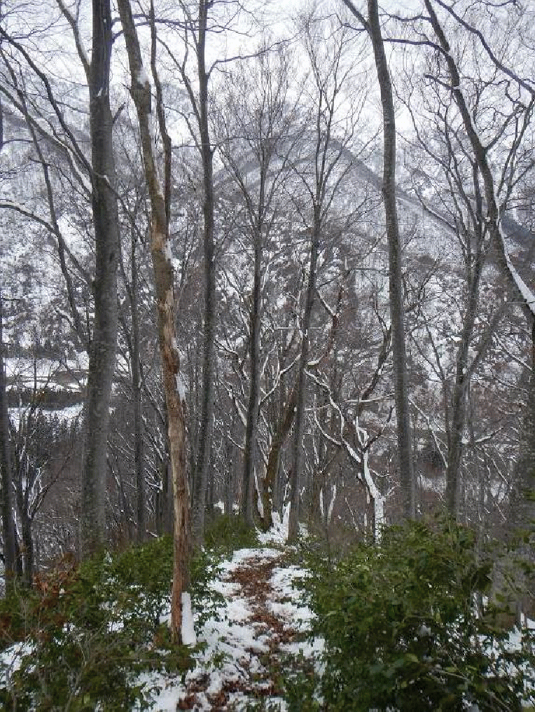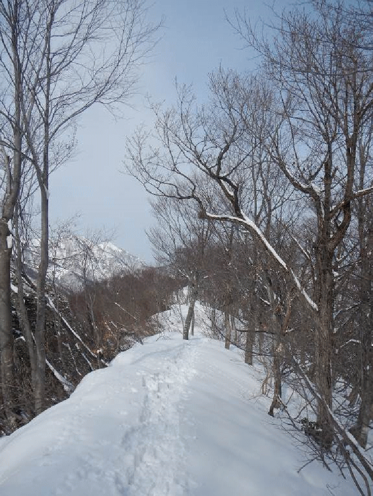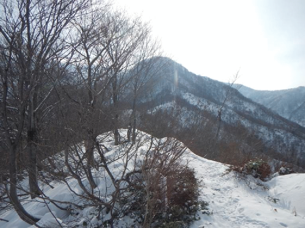 後山は標高858メートルで送電線があるピークだ。そこからは快適な尾根道となるが、そう長くは続かず、威守松山への急斜面となった。いったん解けた雪の上に新雪が20センチメートルくらい積もった状態で、キックステップが利かない。滑って歩きにくく、下りを心配しながら登っていく。