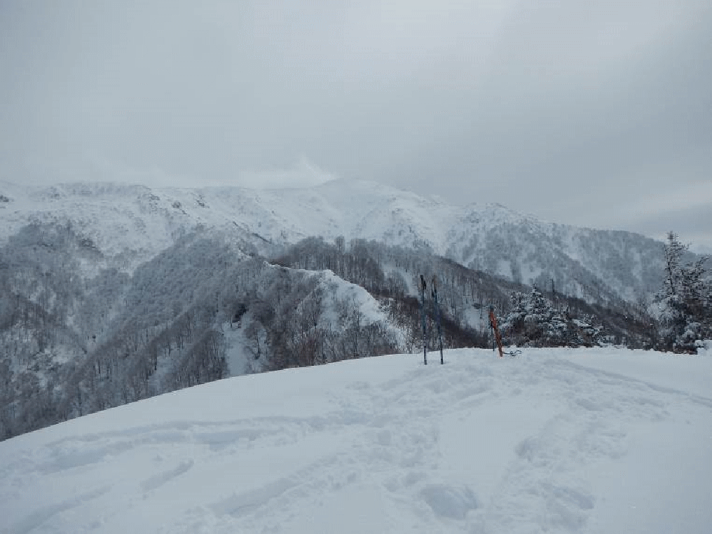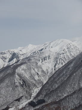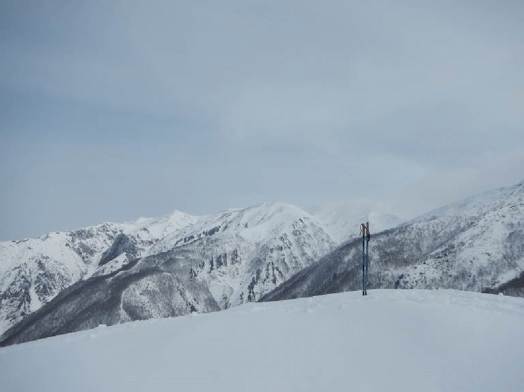 なんとか山頂に着いた。高い山々は雲に覆われてしまっていたが、なんとか展望を望むことができた。巻機山からの谷川連峰に続く分水嶺の山々。清水峠の小屋も見えた。その隣には大源太山の鋭鋒がそそり立っている。苗場山も見えた。広がる雪の峰々。誰もいない山頂。贅沢な時間となった。