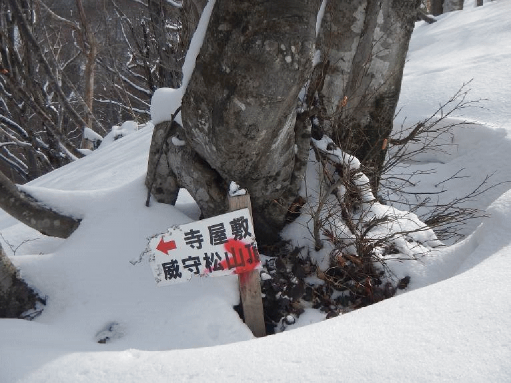 さて、この威守松山。積雪期だけ登れる山かと思ったが、夏道がある。道標の設置や急斜面にはトラロープが張ってあった。今回は雪で隠れてしまっていたが、山頂にも立派な道標があるということだ。巻機山の陰に隠れてしまっているような存在の山だが、巻機山を望む山としては絶好の山となる。