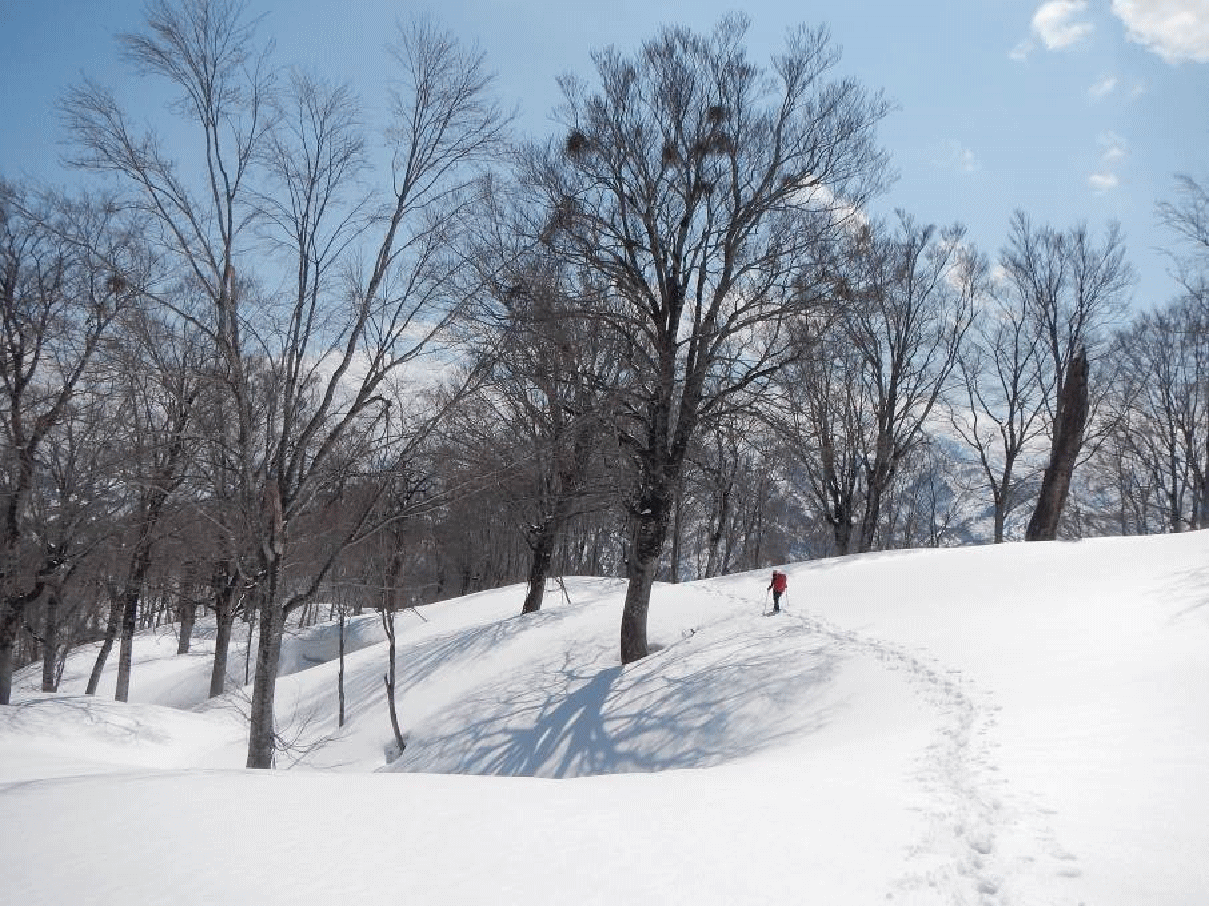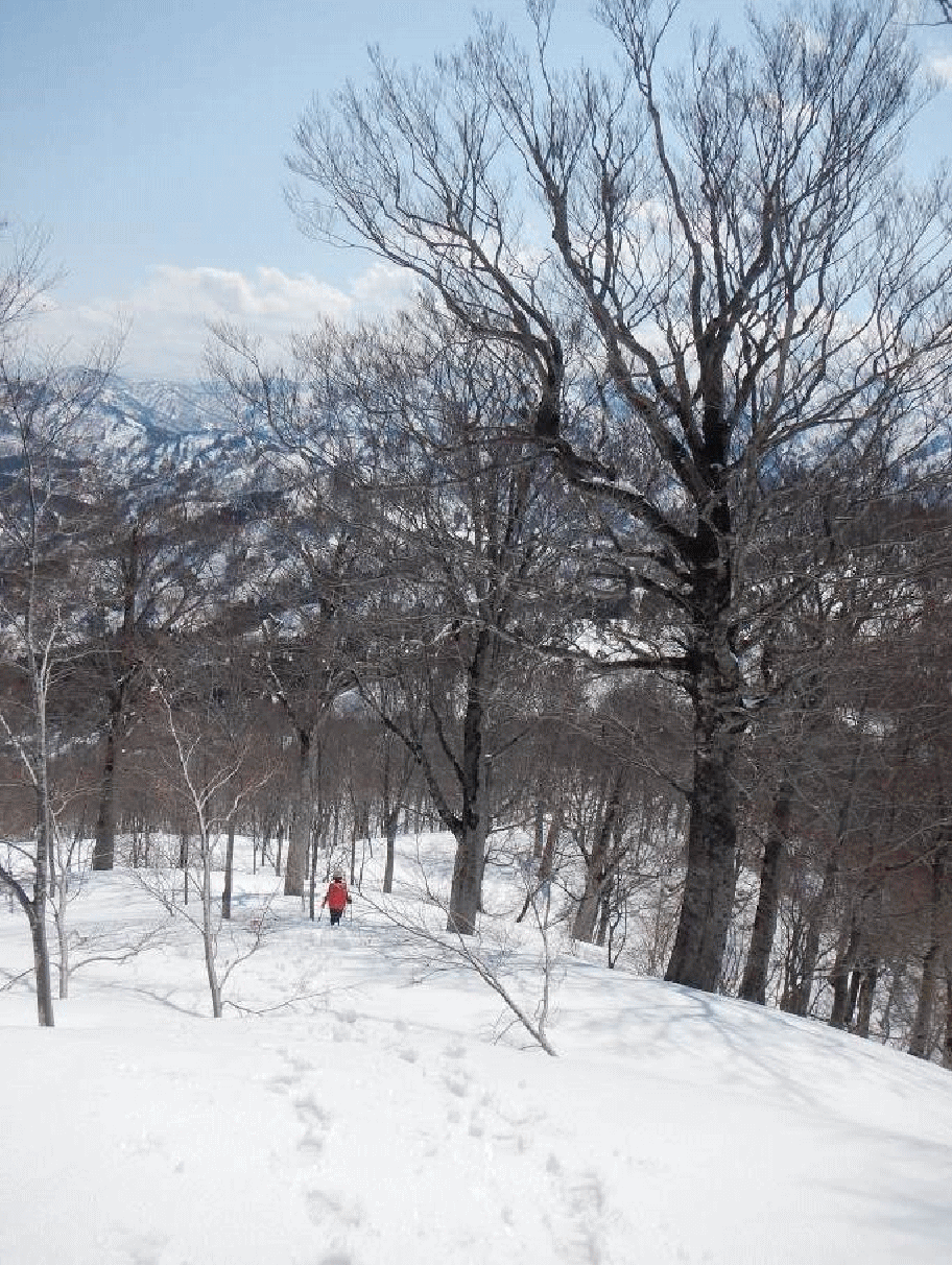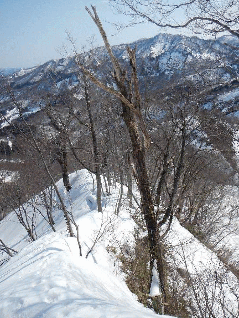 展望台から樽口集落へは除雪なし。樽口峠から尾根上を行く。標高700メートルのピークまではヤセ尾根だが、そのピークを越えると尾根が広くなっていく。744メートルの風倉山のピークはショートカットし、大花山に向かってブナ林のまったりとした尾根歩きとなる。