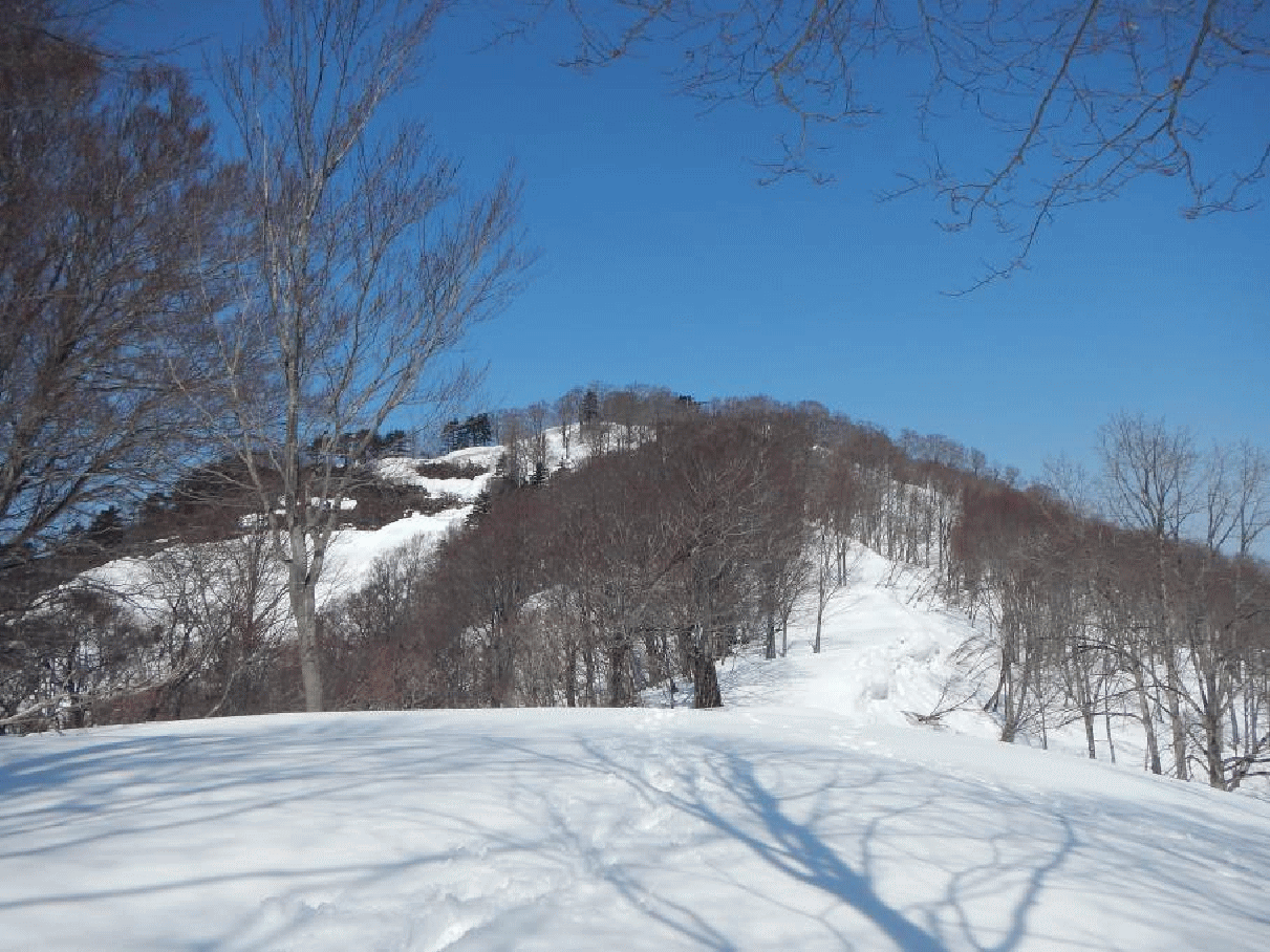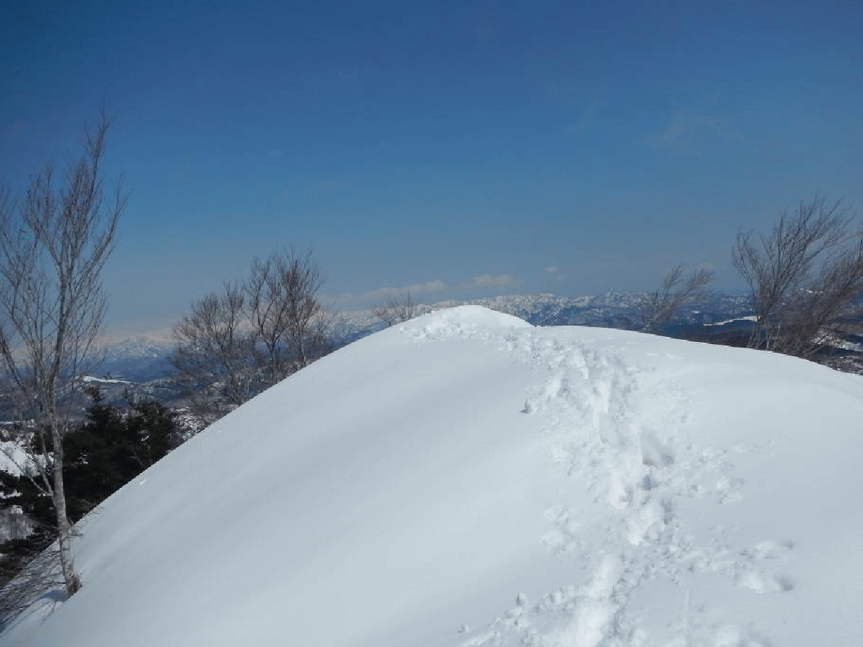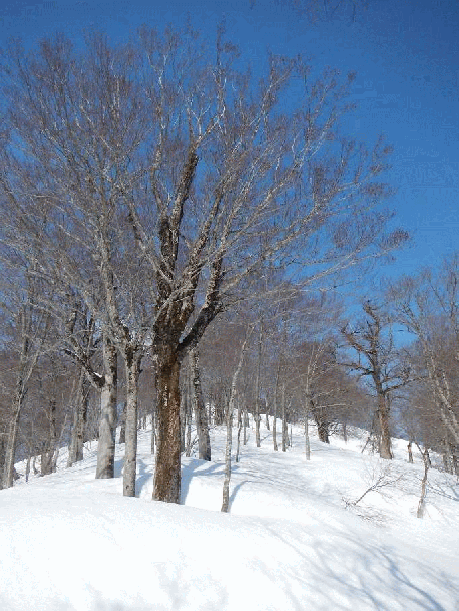 展望台から樽口集落へは除雪なし。樽口峠から尾根上を行く。標高700メートルのピークまではヤセ尾根だが、そのピークを越えると尾根が広くなっていく。744メートルの風倉山のピークはショートカットし、大花山に向かってブナ林のまったりとした尾根歩きとなる。
