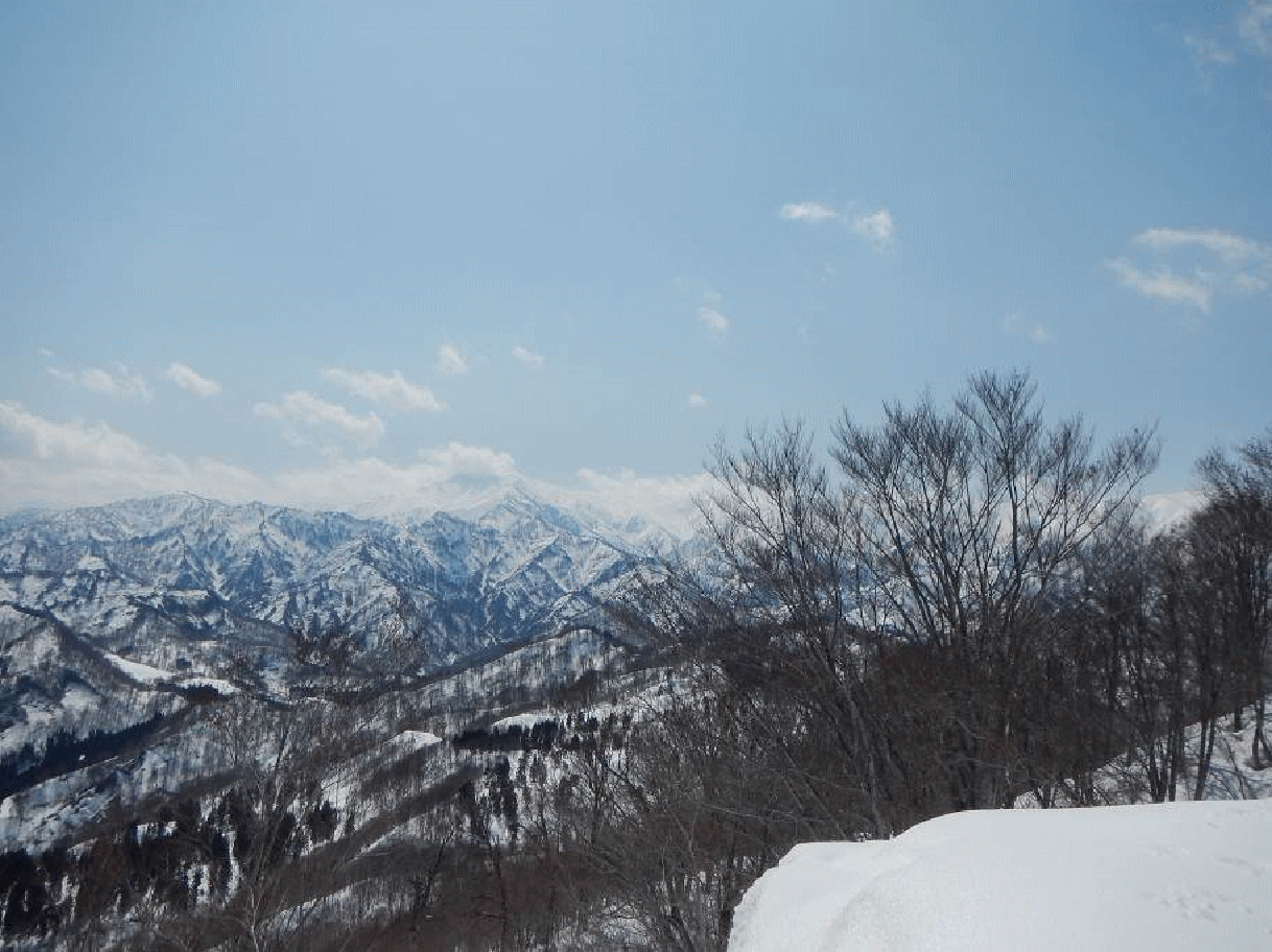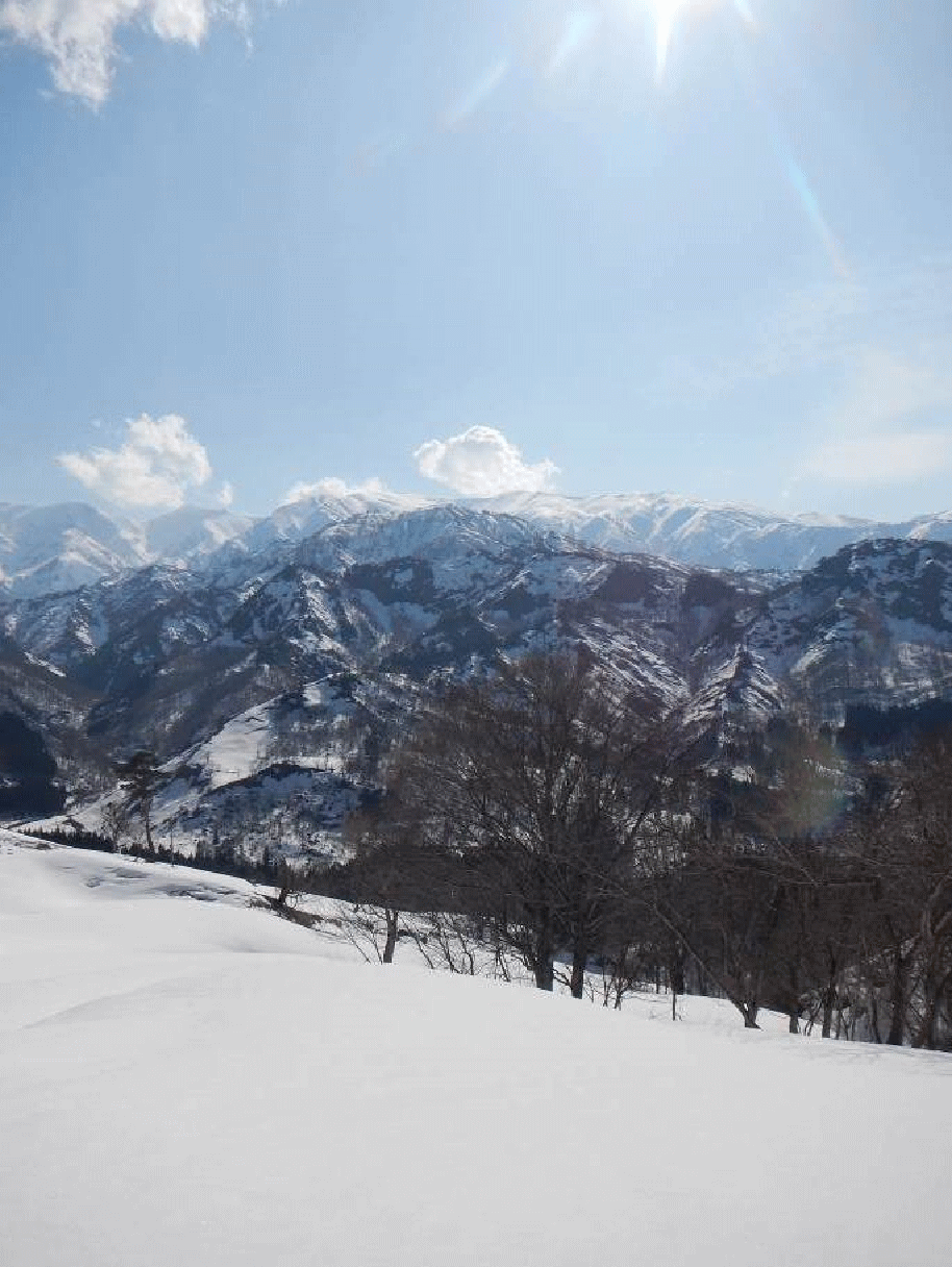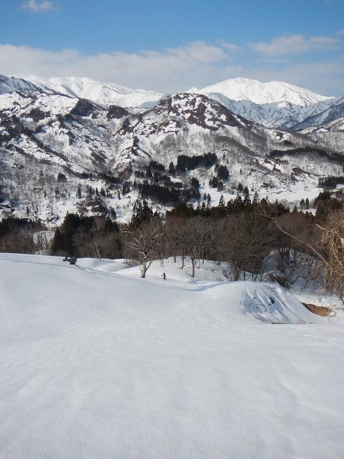 <わらび園の斜面を飯豊連峰を見ながら下る>