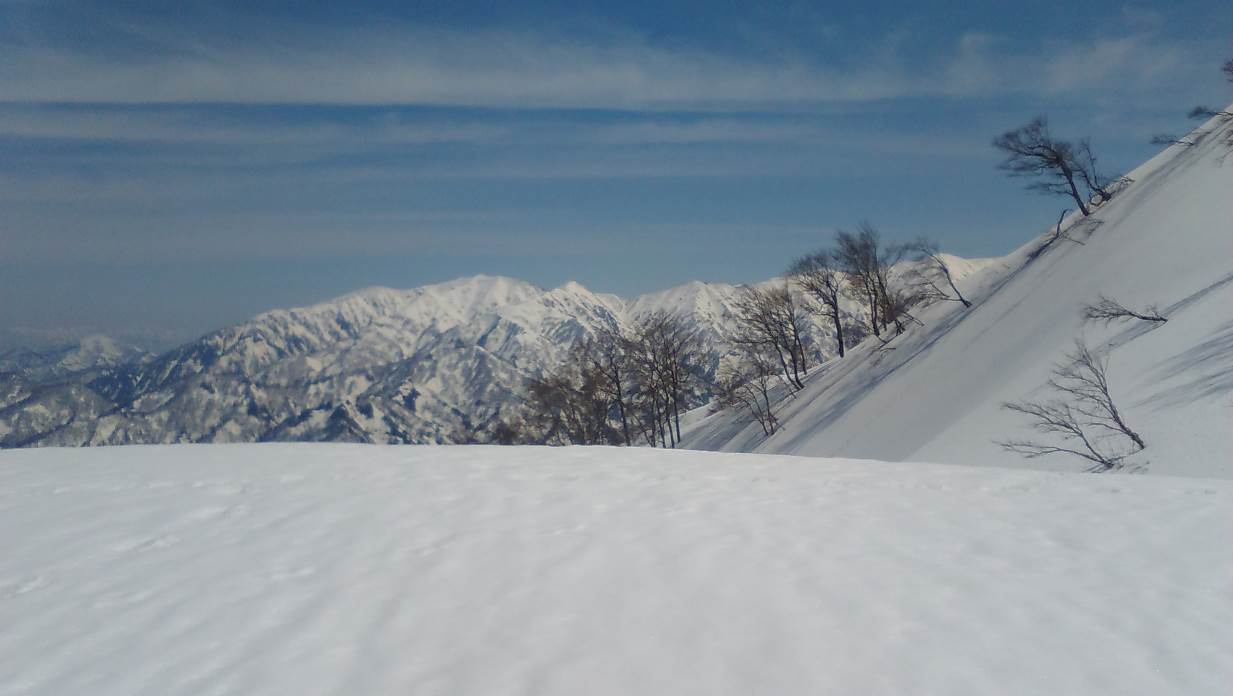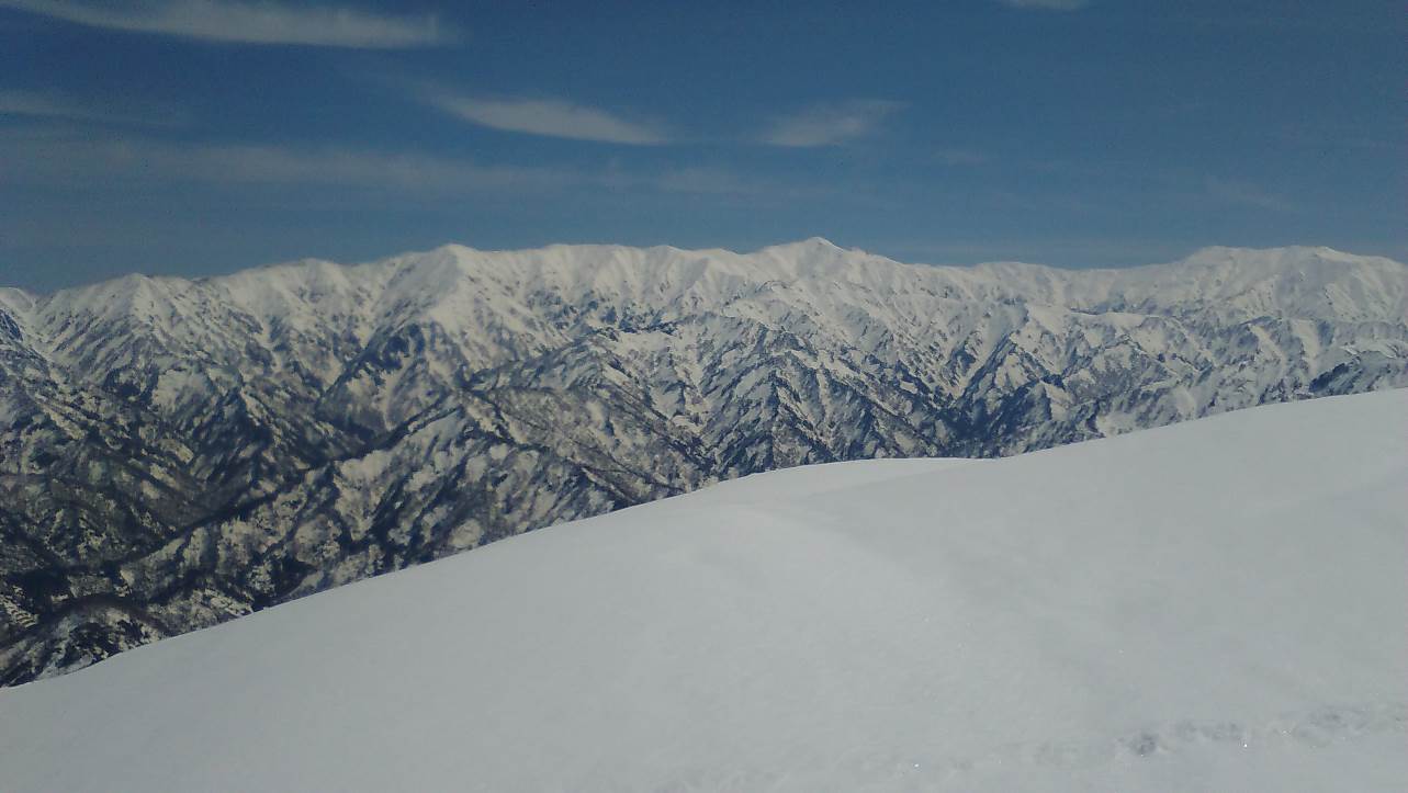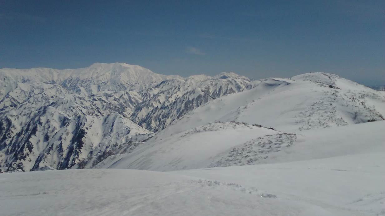 スキー場よりシール登行、中間部はガチガチのクラストためスキーを担いでキックステップで行く。スキー場をあとにゆるやかにアップダウンで主稜線に近づくと東に杁差と鋒立の鋭峰が印象的に見えるそして南に頂上が間近になる、主稜線に上れば飯豊を見ながらの稜線漫歩である。二日まえの守門の厳しい登りの疲労もすっかり取れたようだ。頂上で友人の到着を待って下山する。雪は気温が高いにもかかわらずザラメに近く快適なスキー滑降であった。