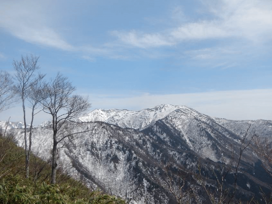東谷山を振り返る。苗場山もセットで見える。こちらも木々が目立つ。