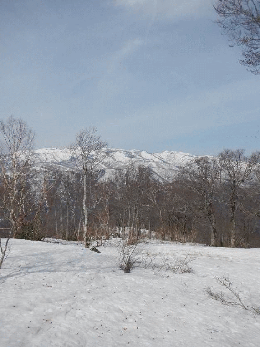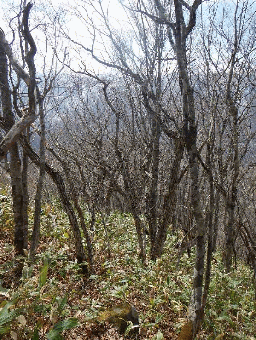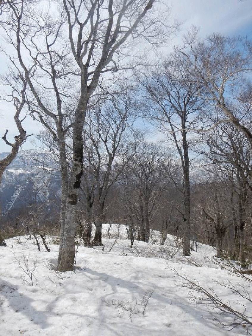 鉄塔から上はヤブ。標高1300メートルあたりからブナ林となり安定して雪の上を歩くことができた。