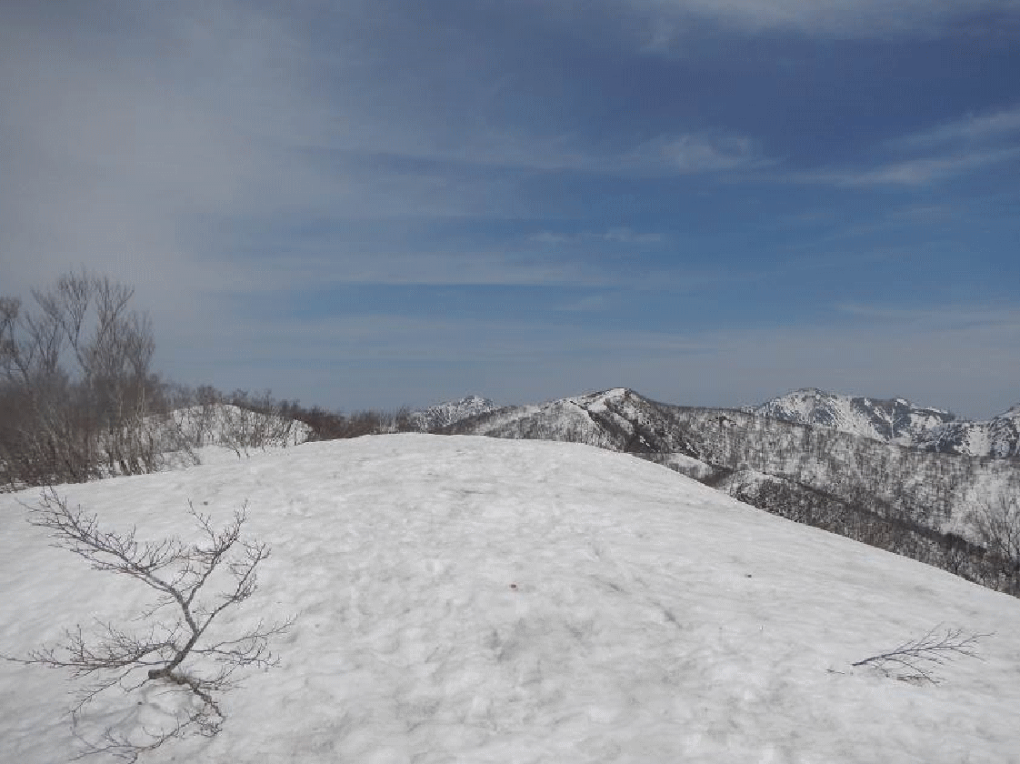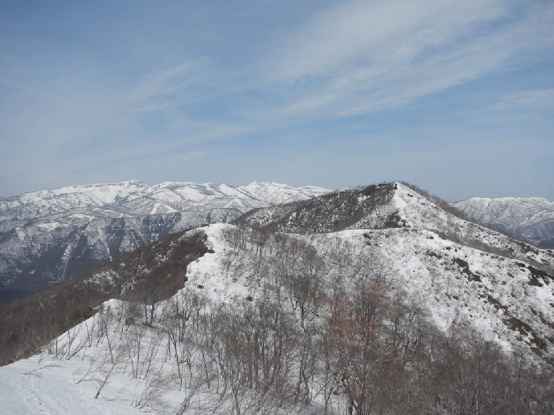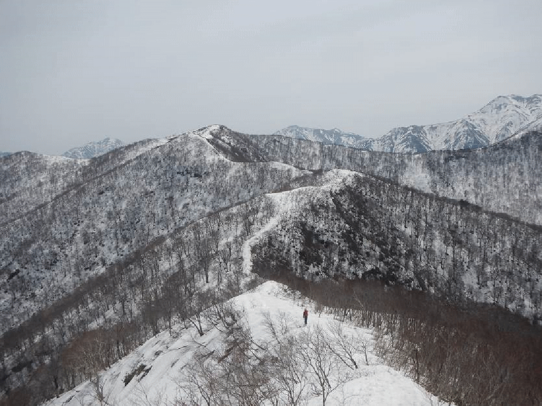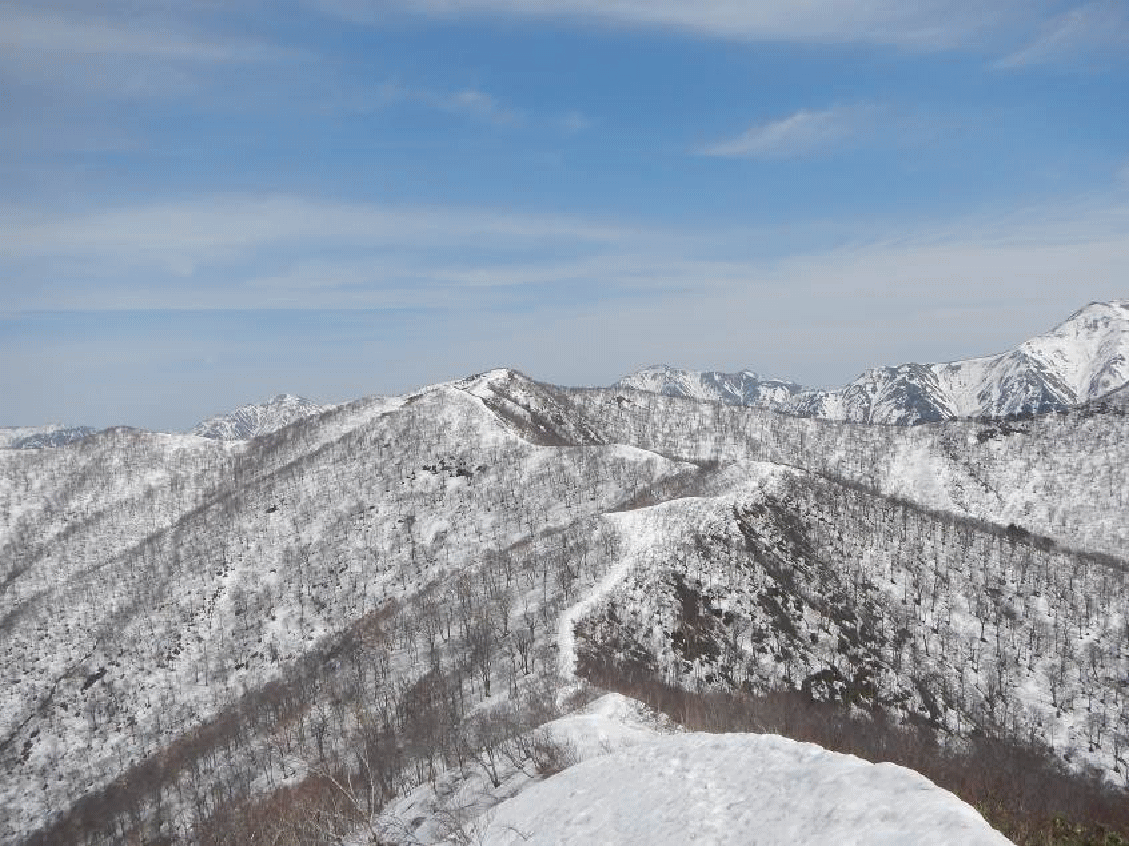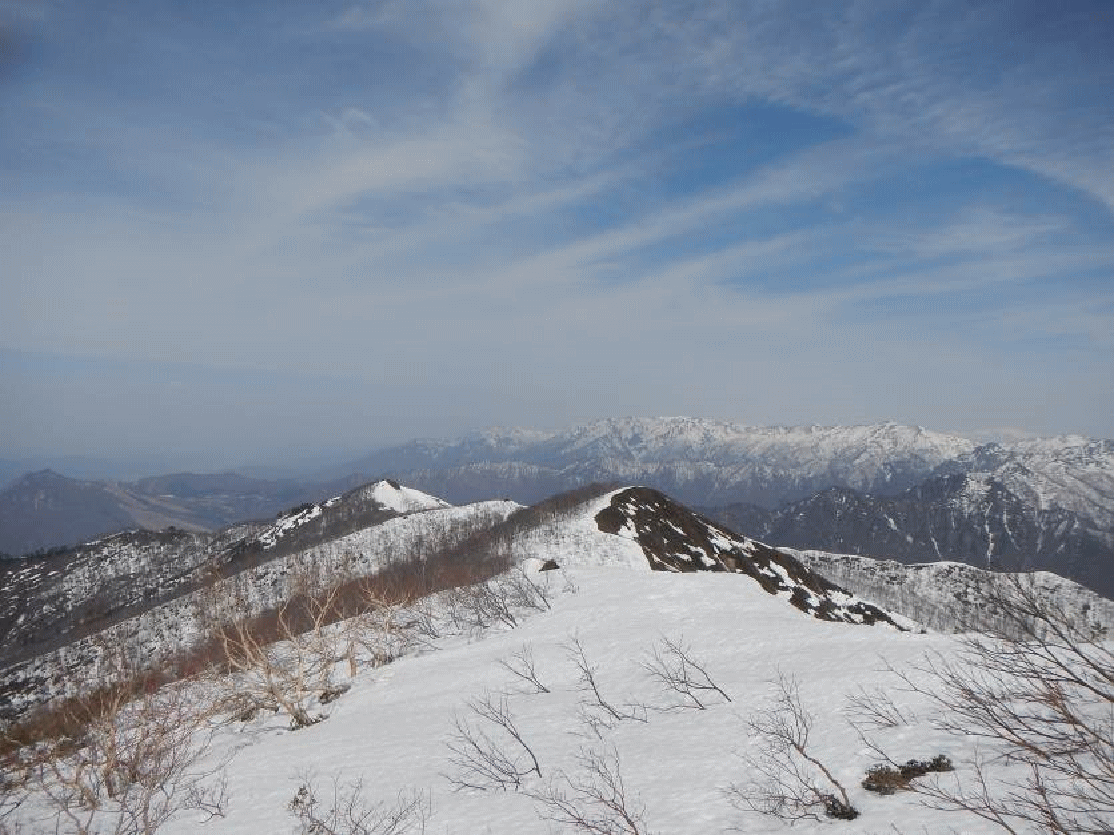 東谷山から日白山への尾根。数年前は4月下旬に登った。その時よりも、雪が少ない。山が黒々として見える。