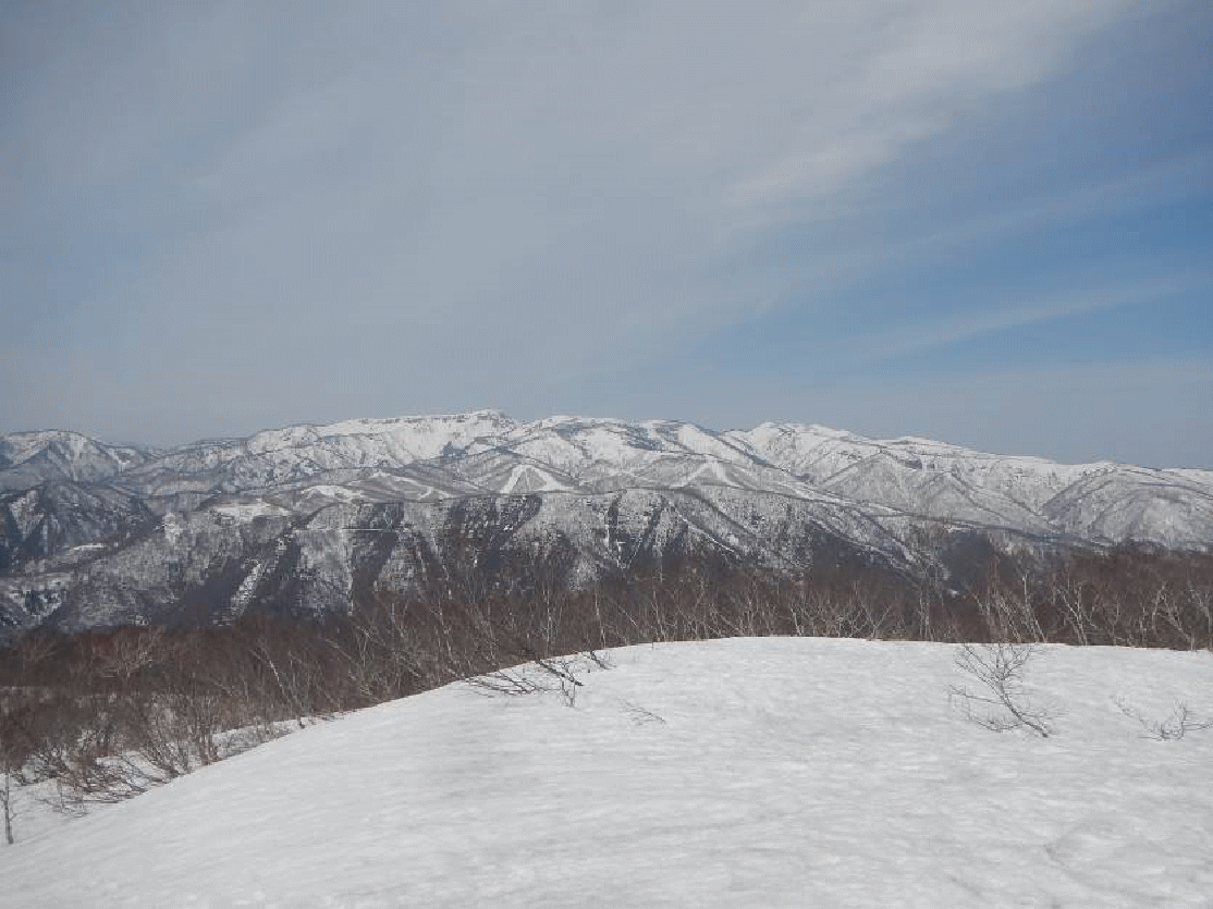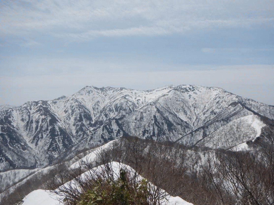日白山からタカマタギを見る。遠景は国境稜線の山々。