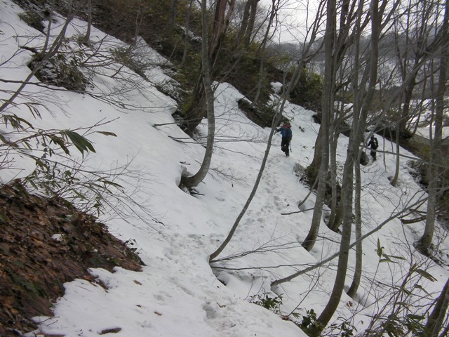 ここでスキーを履いても登れそうだが,せっかくザックにスキーを付けたので,尾根に上がるまでそのままつぼ足で直登する.