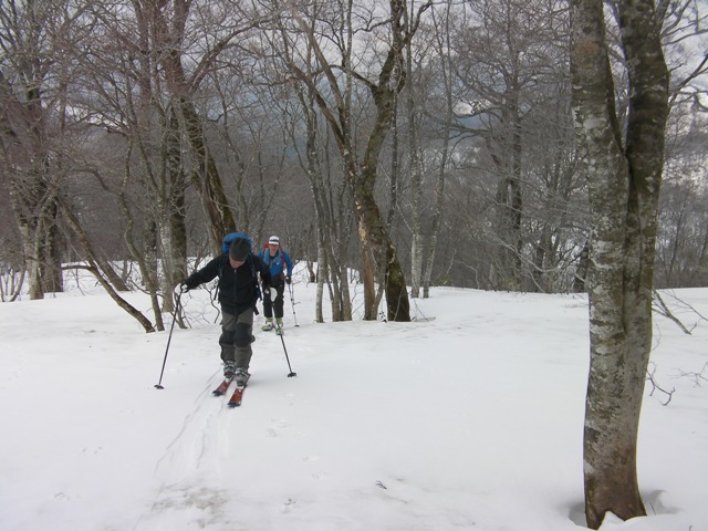 標高940mピークを登り返し,孫六温泉の登山口近くまで最後の一滑りだ.