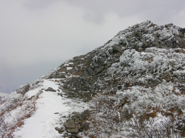 山頂直下まで,灌木の間を縫ってなんとか登る.