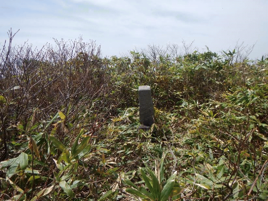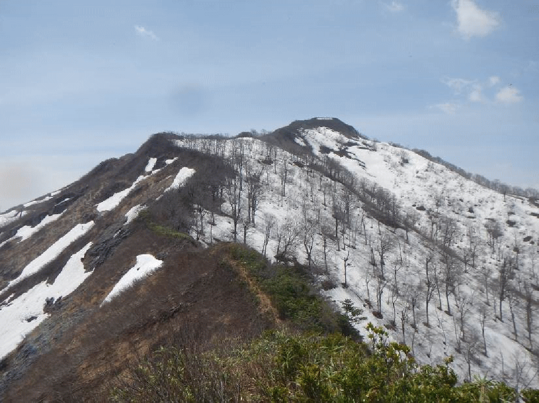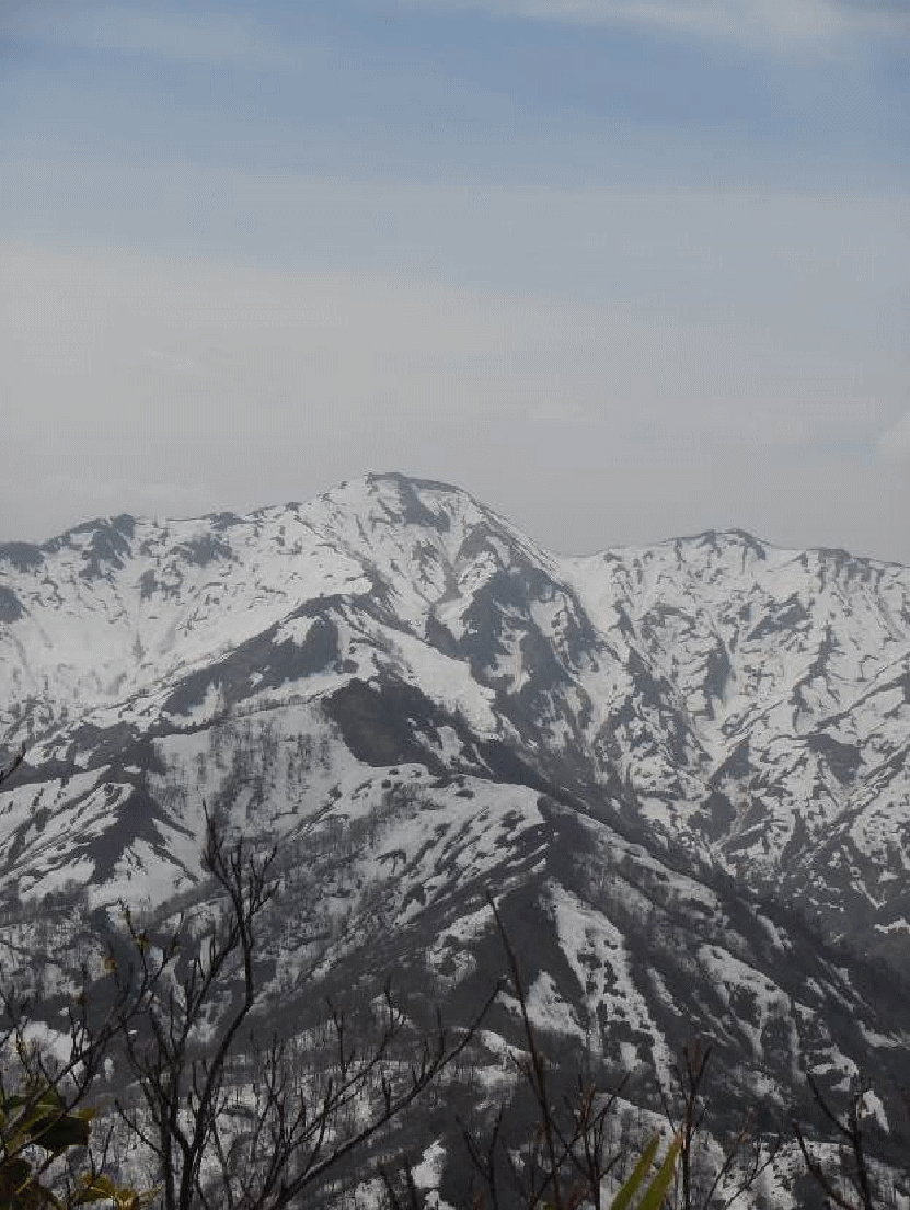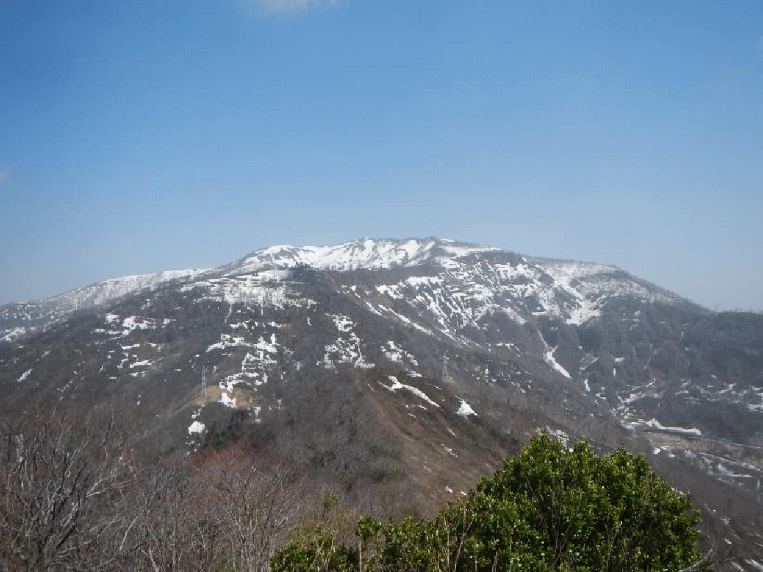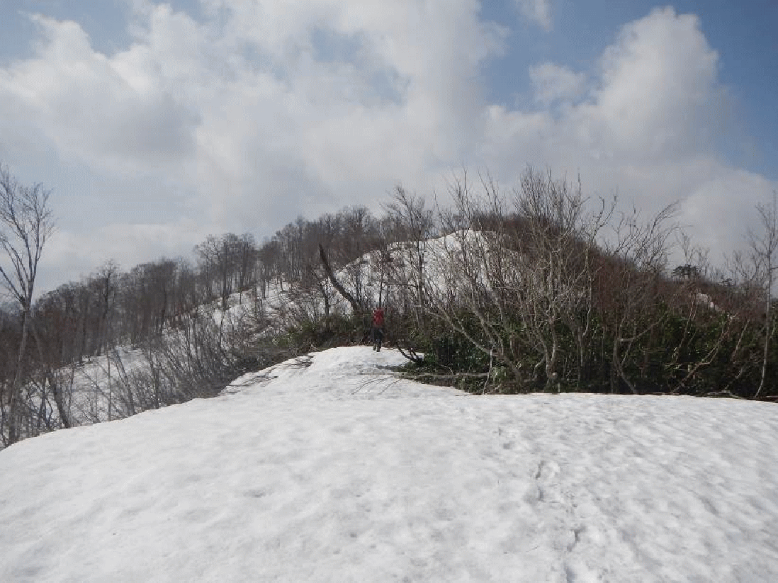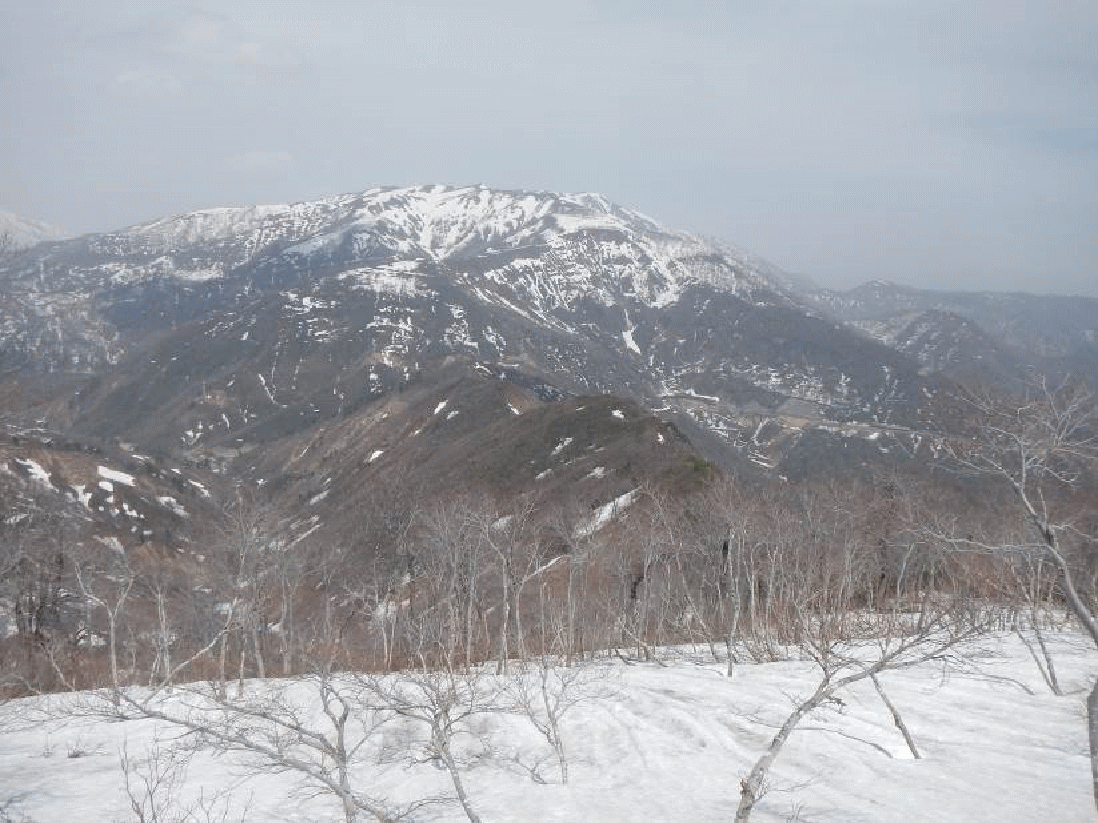 振り返ると樹間に大きく浅草岳が見え、前毛猛山も近づいてきていた。大鳥沢源頭だろうブナ林が広がる雪斜面を登りヤブの中に入ると、山頂となった。小さく刈り払いがしてある山頂には大きな三角点があった。展望は良い。それまで姿を見せなかった毛猛山は大きくそびえ立って見えた。険しい尾根が続く果てしない向こうに見える。