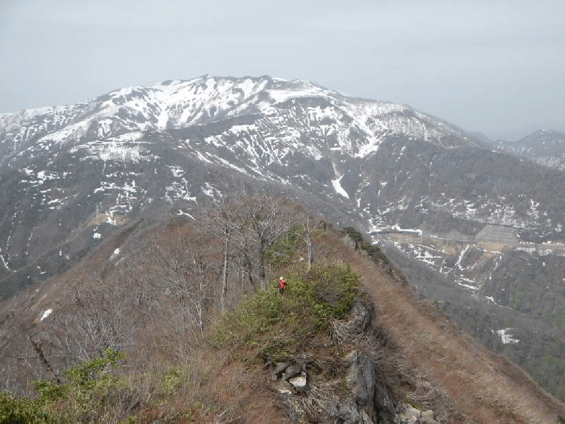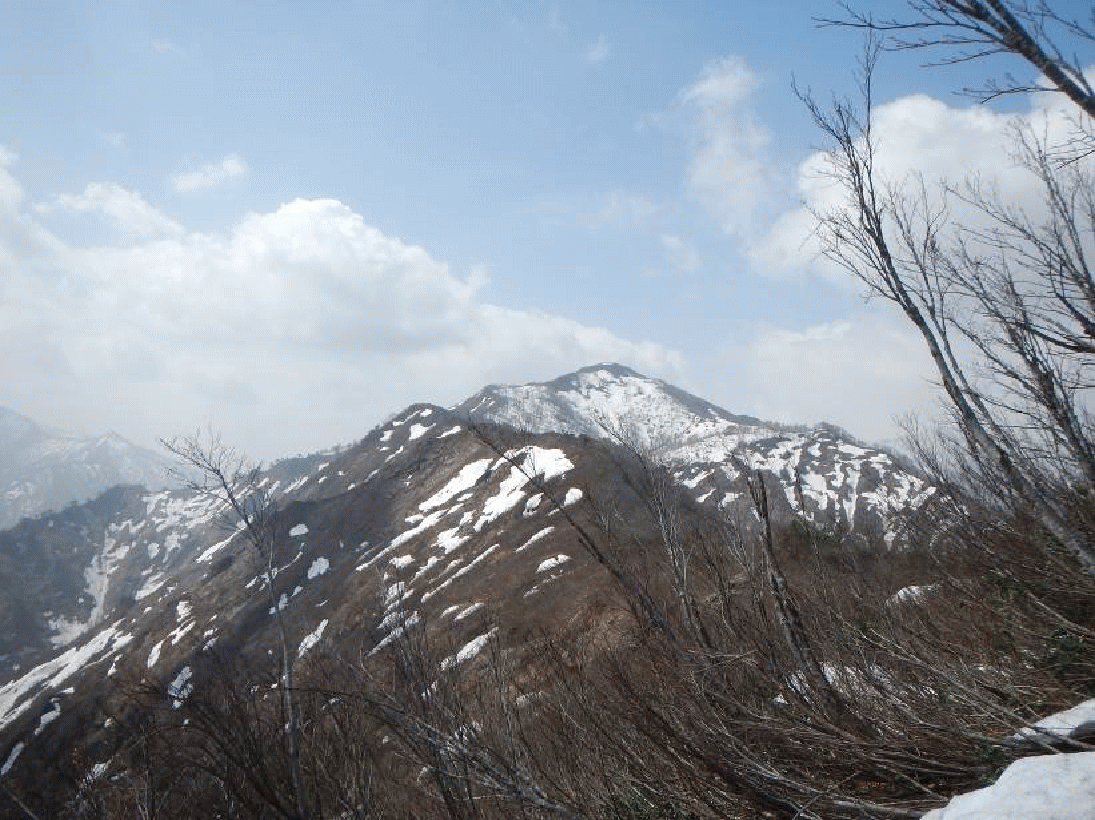 まずは鬼ヶ面山の登山口から入る。県境の尾根にぶつかると雪原になり、南方面へと方角を変え、広い雪斜面を標高962メートルピークに向かう。無情にもそのピークで雪は切れ、あとはヤブとなる。どんな大雪でもこの尾根には雪が付かないだろうと思わせるヤセ尾根だ。ヤブが薄くなったと思っても、またヤブの中に入る。アップダウンを繰り返しながら少しずつ標高を上げていく。