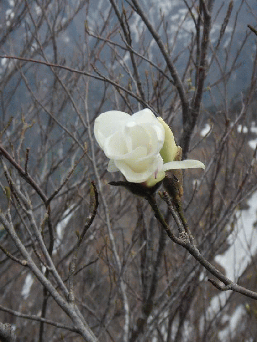 残雪期の前毛猛山。大鳥沢をつめると2時間ほどのコースタイムで登頂できるらしい。国道252号線も早々と開通したことだし、出かけてみることにした。しか〜し、六十里越トンネル脇に着いてみると、大鳥沢はゴーゴーと音を立てながら水しぶきをあげていて、登れそうもない。さて、どうしよう。駐車場から見る前毛猛山は格好がよい。天気は高曇りながら良さそうだ。県境尾根を登るという大決断をしてしまった!?