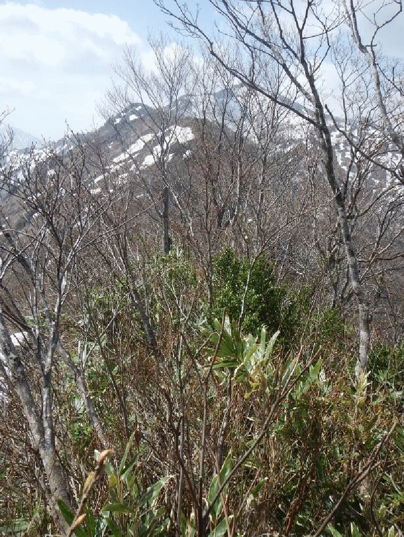 <浅草岳を見ながらヤブの中を下る>