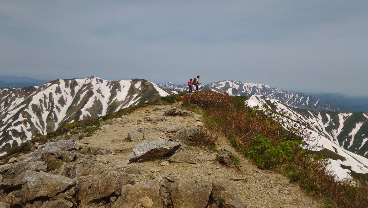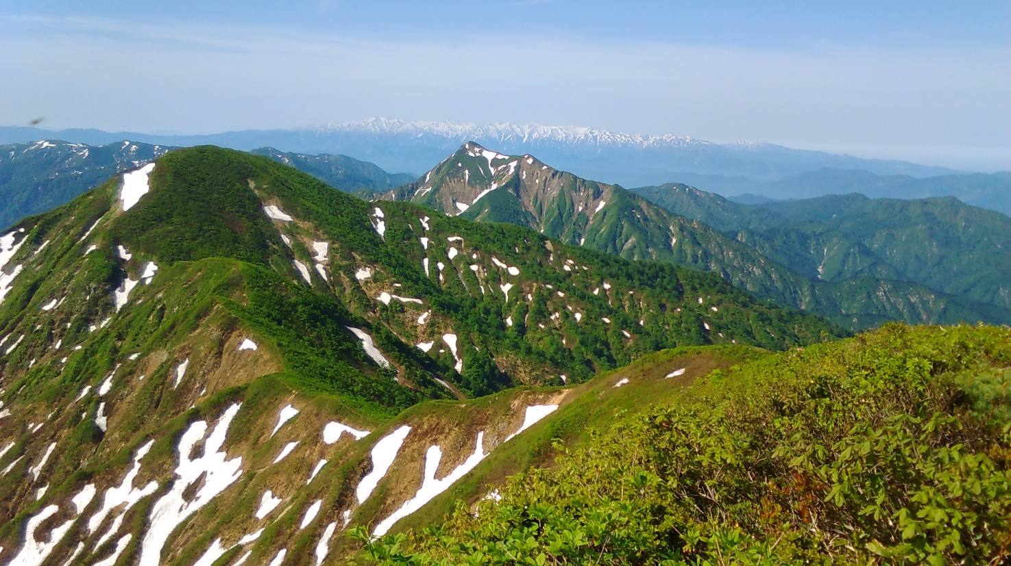 北大玉山(左)祝瓶山(真中)と遠くに飯豊連峰