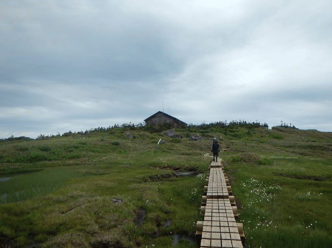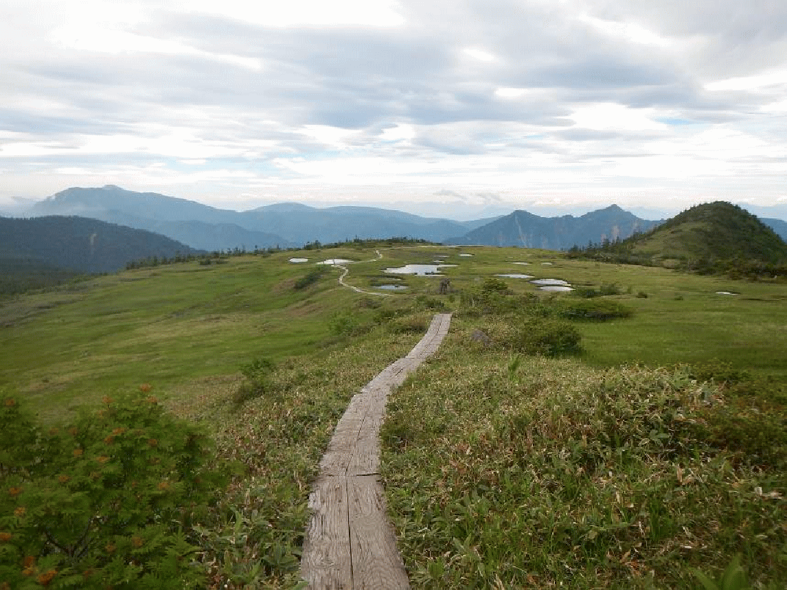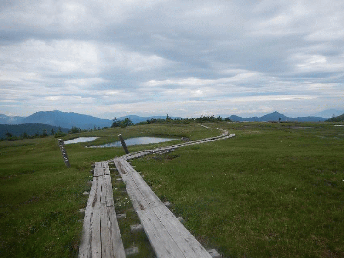 ふと、苗場山に行こうかな、という気になり、小赤沢コースから登った。登山口から2時間くらいで山頂湿原の端っこに出た。池塘が点在する湿原が山頂まで続いていく。広い山頂台地なので人もあまり気にならない。梅雨の時季、ほんのちょっとの晴れ間の中、素晴らしい光景を楽しむことができた。