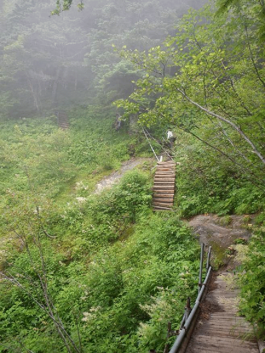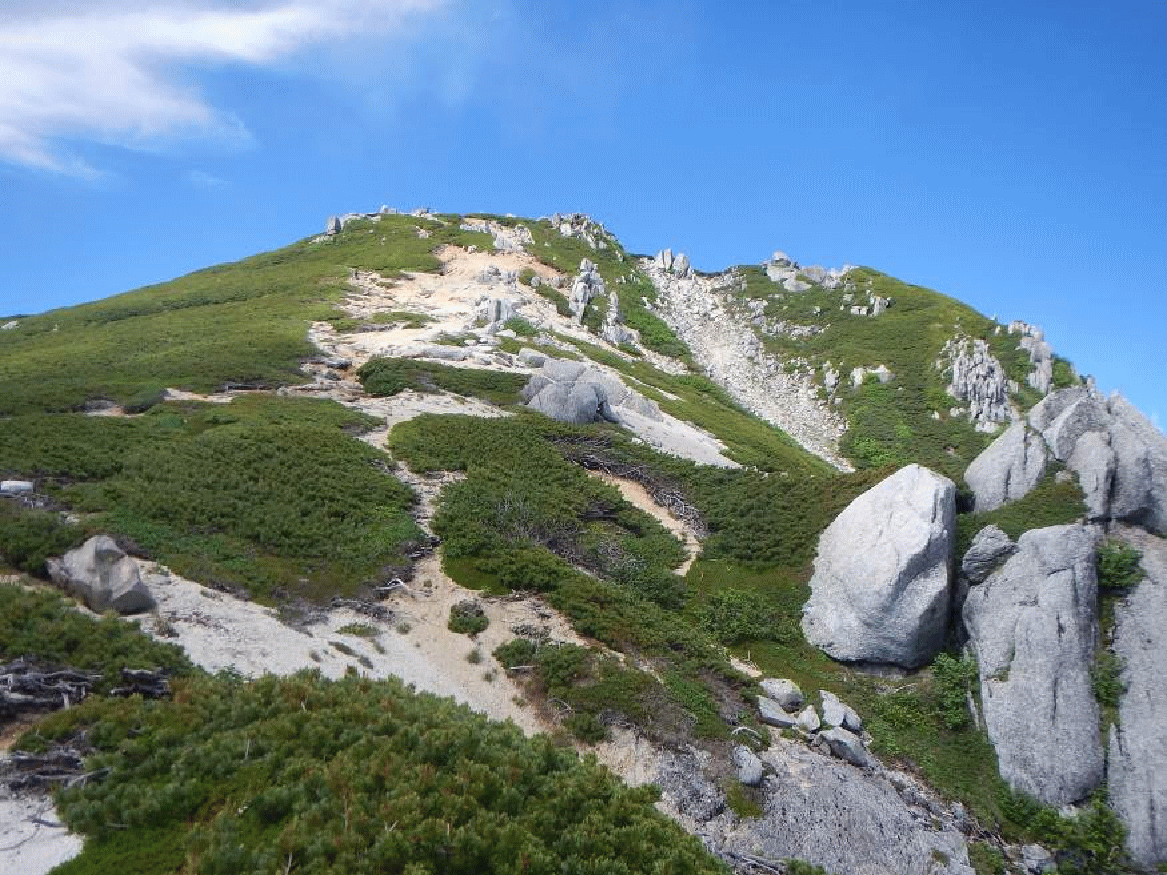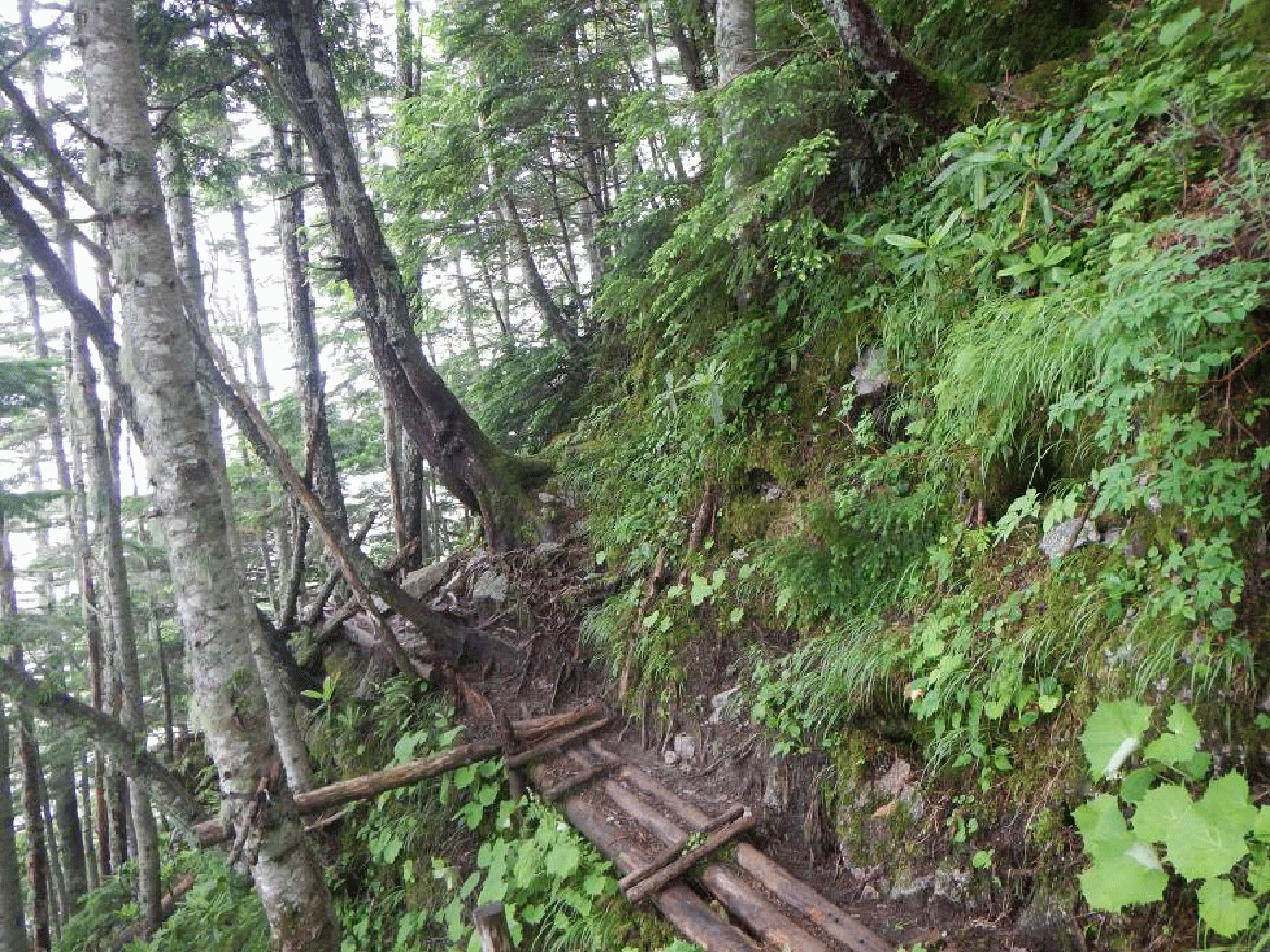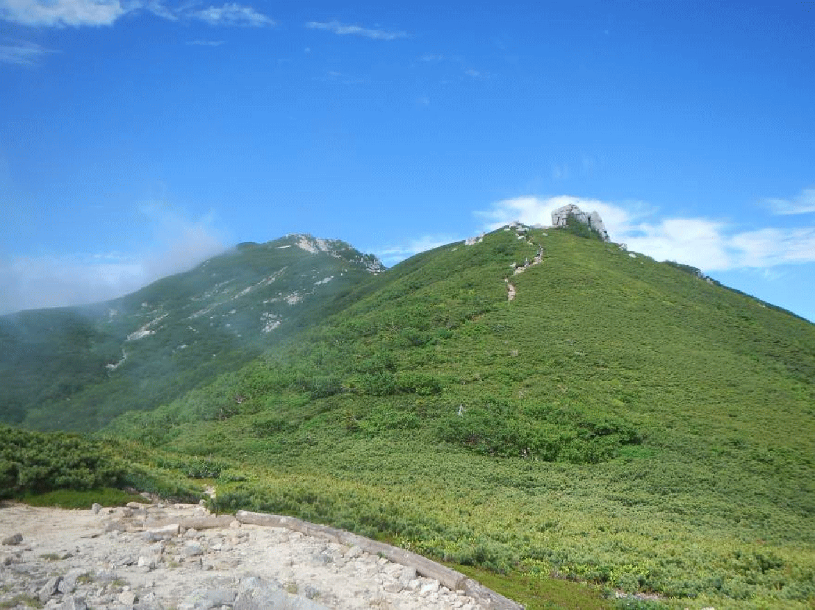 ジグザグと緩やかに付けられている登山道を行く。水場がある池山尾根分岐、マセナギを過ぎると登山道の傾斜も増し、大地獄、小地獄のクサリ場やハシゴ、階段登りが出てくる。トラバース気味の道が終わり、尾根上になると、避難小屋分岐だ。駒石経由で山頂を目指すと、すぐに森林限界を越えた。