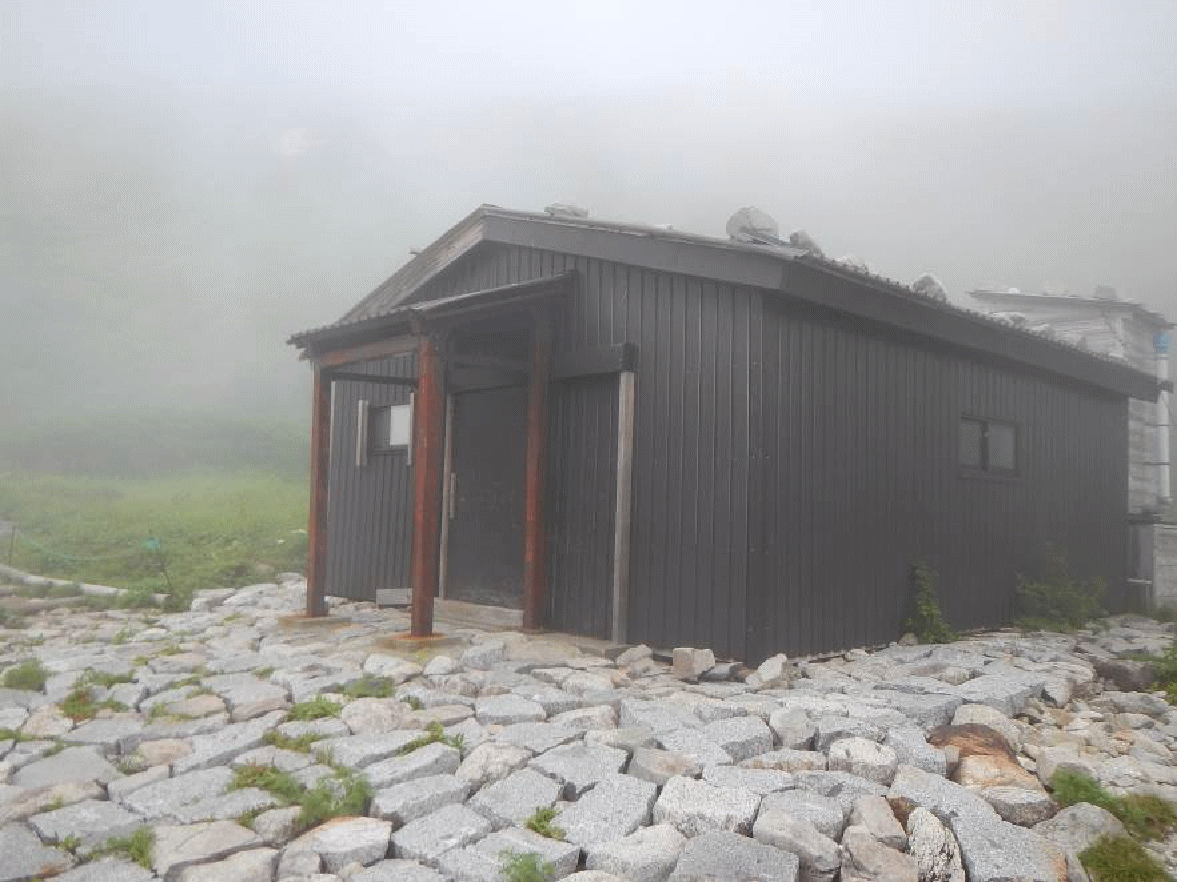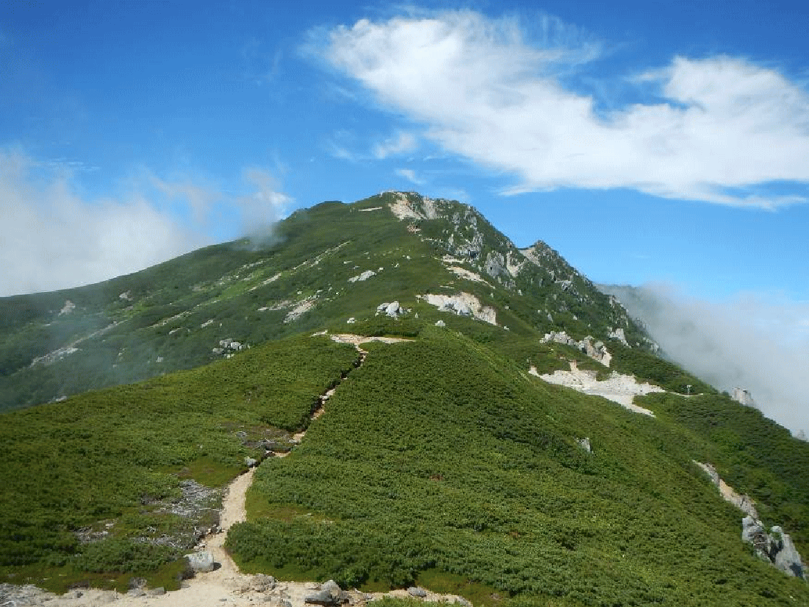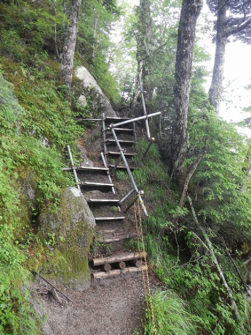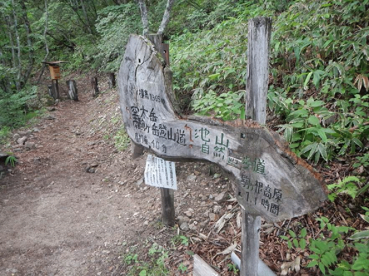 ジグザグと緩やかに付けられている登山道を行く。水場がある池山尾根分岐、マセナギを過ぎると登山道の傾斜も増し、大地獄、小地獄のクサリ場やハシゴ、階段登りが出てくる。トラバース気味の道が終わり、尾根上になると、避難小屋分岐だ。駒石経由で山頂を目指すと、すぐに森林限界を越えた。