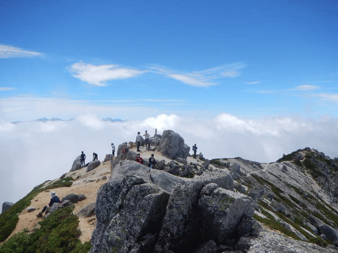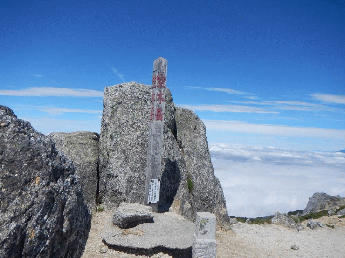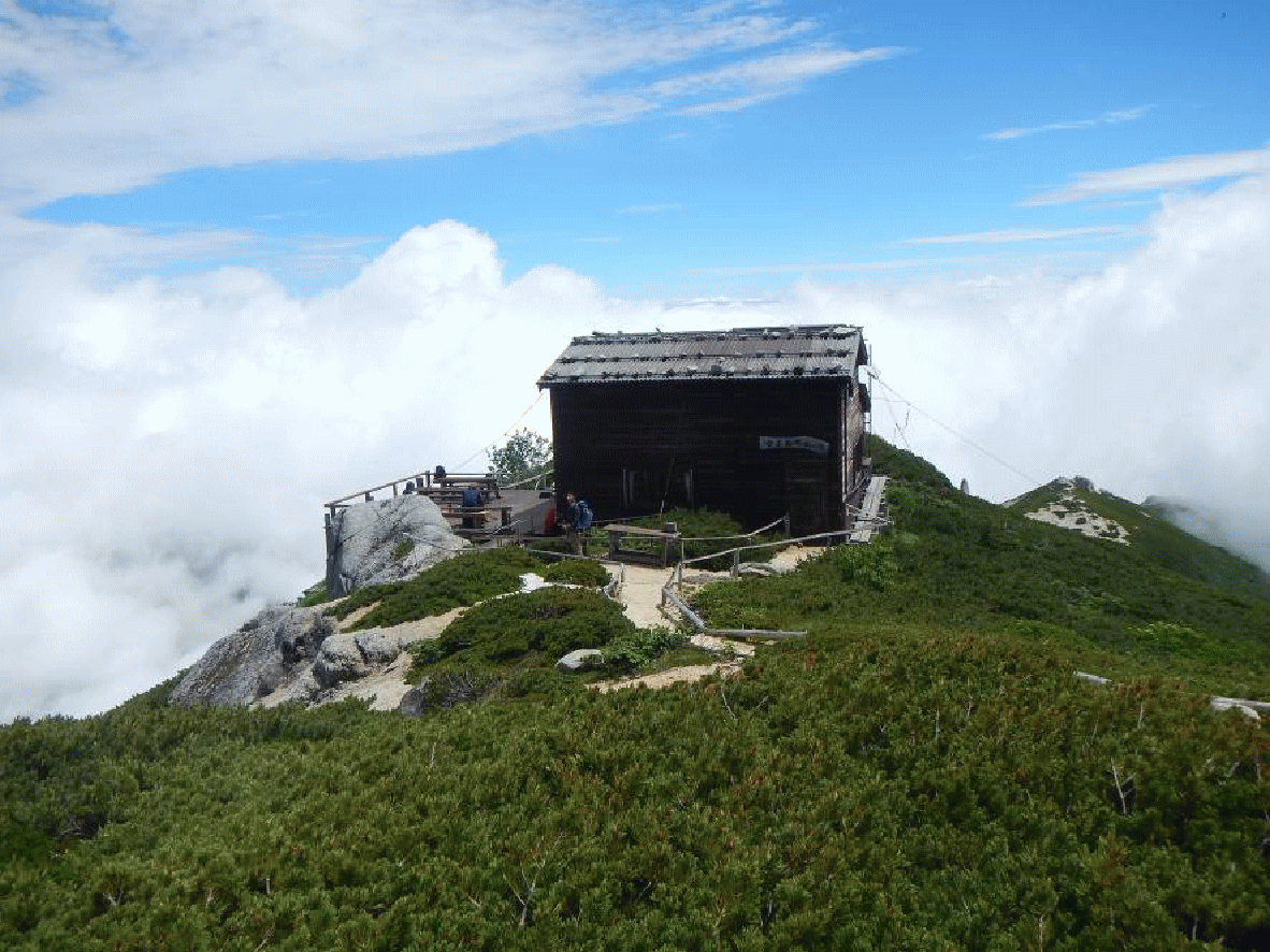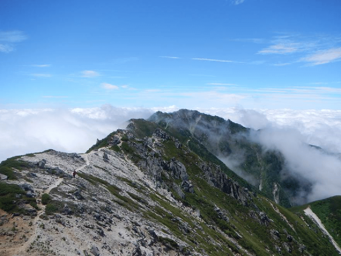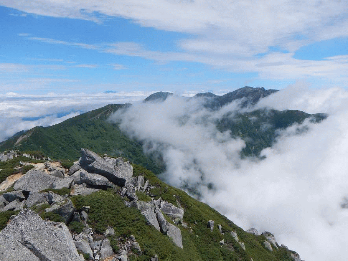 雲の中を登ってきたが、森林限界を越えると雲海の上に出た。青空の下、稜線漫歩で山頂に向かう。山頂からは素晴らしい展望を得られた。雲海の上に峰々が連なっている、素晴らしい光景が広がっていた。帰りは空木平の避難小屋経由で分岐まで戻るが、小屋までのカールはお花畑だった。