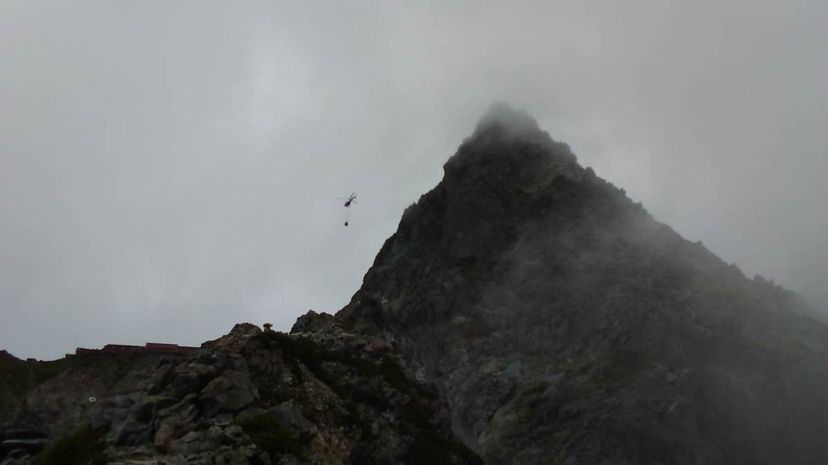東鎌尾根上部から槍の穂 ヘリが荷揚げをしている