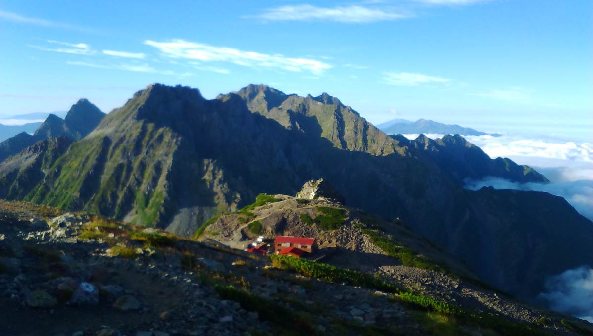 2日目 今日は快晴、荷上でヘリがテント場近くに飛来するので早めに出発する。テント場から約30分の下りで大天ヒュッテのある喜作新道に合流する。