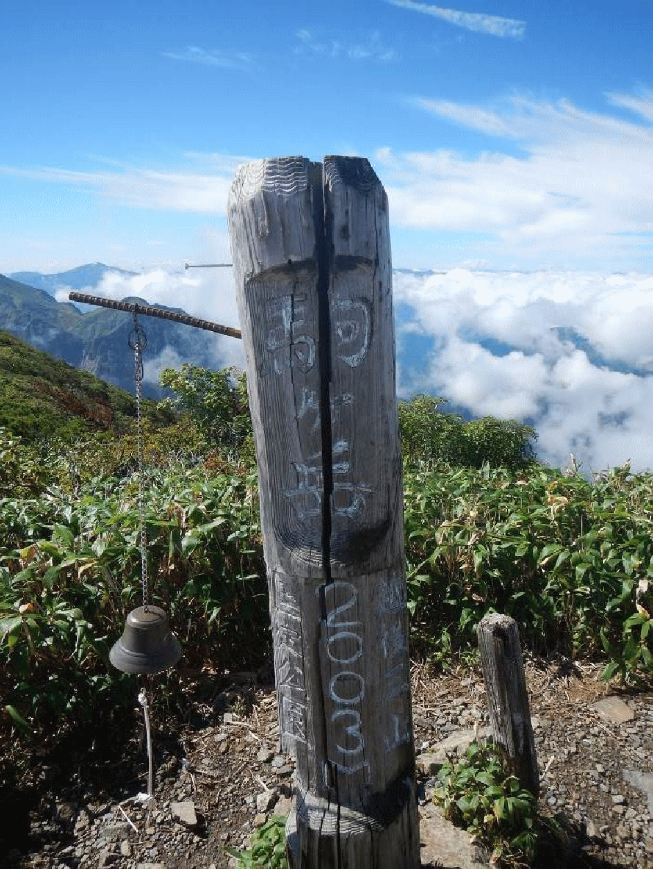越後駒ヶ岳山頂は雲海の上にひょっこりと出ていた。顕著に見えるのは中ノ岳くらい。隣の八海山も雲の中だ。中ノ岳の奥に見えるのは巻機山へと連なる山、下津川山とか小沢山とかになるのだろうか。たなびく雲海の中にポコリポコリとピークが見えるが、名前が指呼できないのがもどかしい。