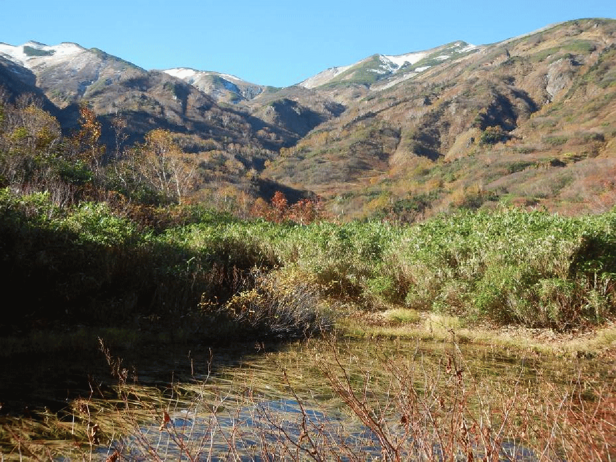 下りは小蓮華山〜白馬大池経由。白馬岳の悠大な展望を楽しみながら下る。白馬山荘泊の登山者が多く、何人もにすれ違う。それでもあの夏の登山者の数の比ではない。寒かった山頂も稜線から少し下ると暖かい。少し傾いた日差しの白馬大池を過ぎ、明るいうちに蓮華温泉まで下ることができた。ふもとは秋の風情なのに、高い山々はすでに冬の入り口にきている。こんな好天は今年あと何回あるのかな、なんて思いながら下山した。