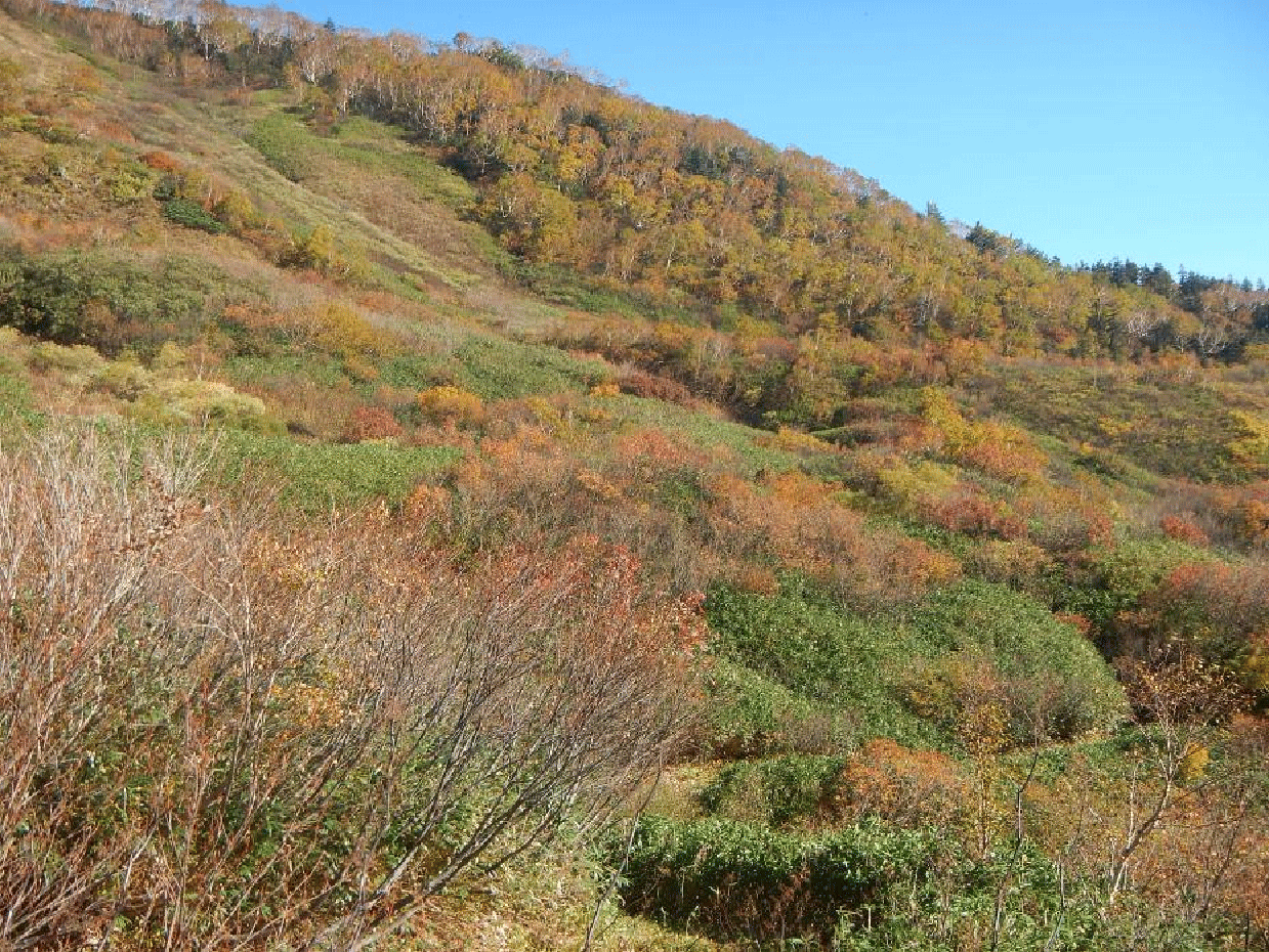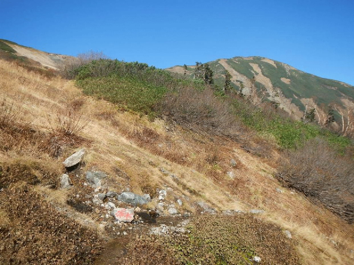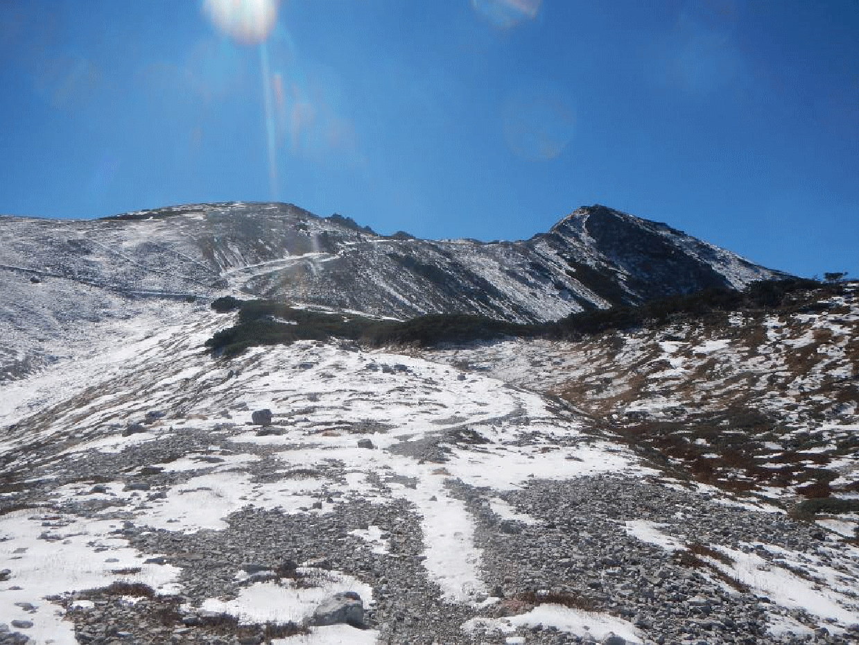 小屋終い=山終いの白馬岳に出かけてきた。登りは前回下った鉱山道。瀬戸川に架かる橋を渡れば、緩やかな登りが続いていく。池塘がある神ノ田圃を過ぎ、沢をいくどか渡渉しながら、高度を上げていく。鉱山道の紅葉の盛りは過ぎてしまっていた。白馬岳のほうは雪で白く見え、三国境の下から雪の上を歩くようになる。鉱山道では下りの2人パーティーに会ったのみ。三国境まで来ると、やっと登山者の姿を見かけるようになった。