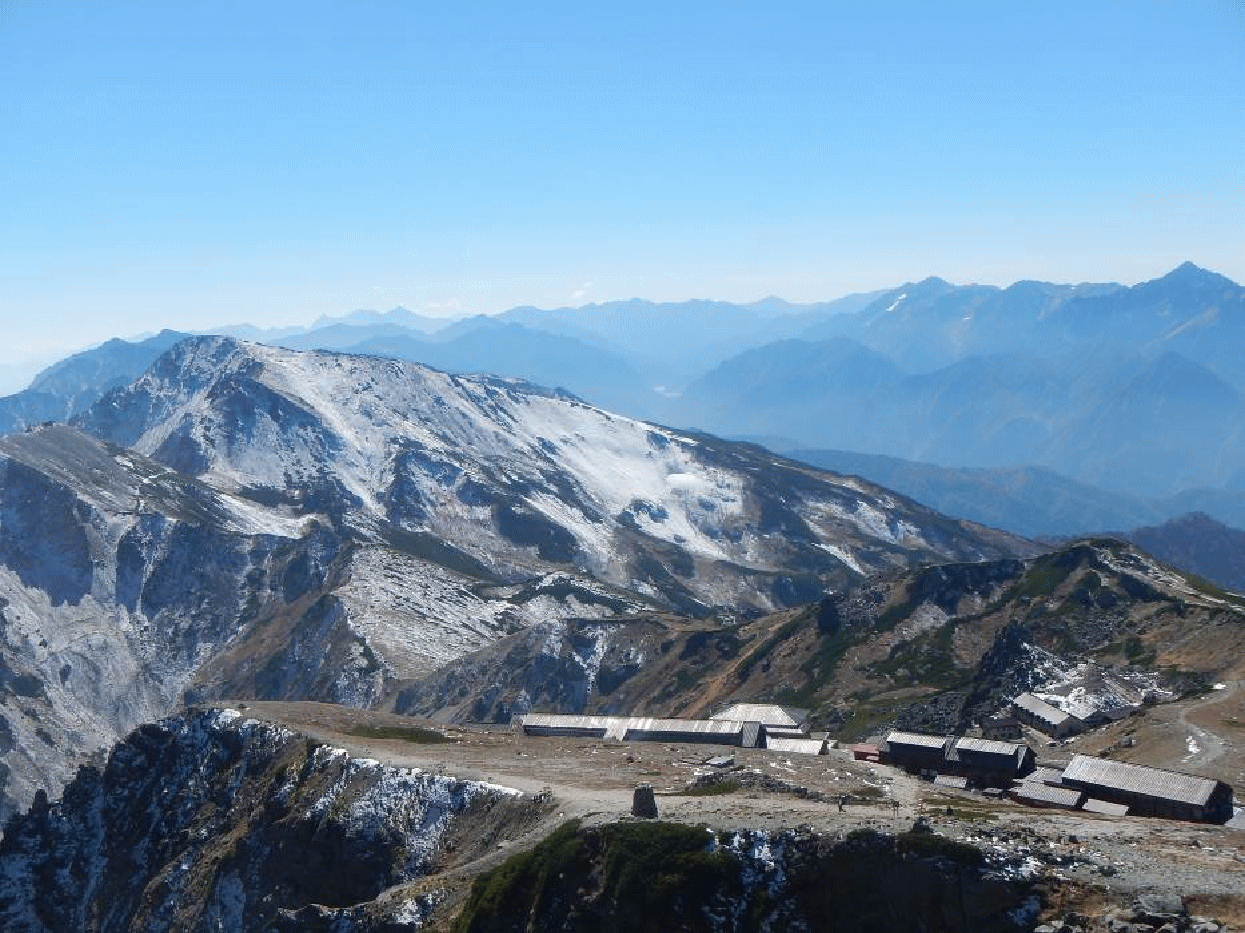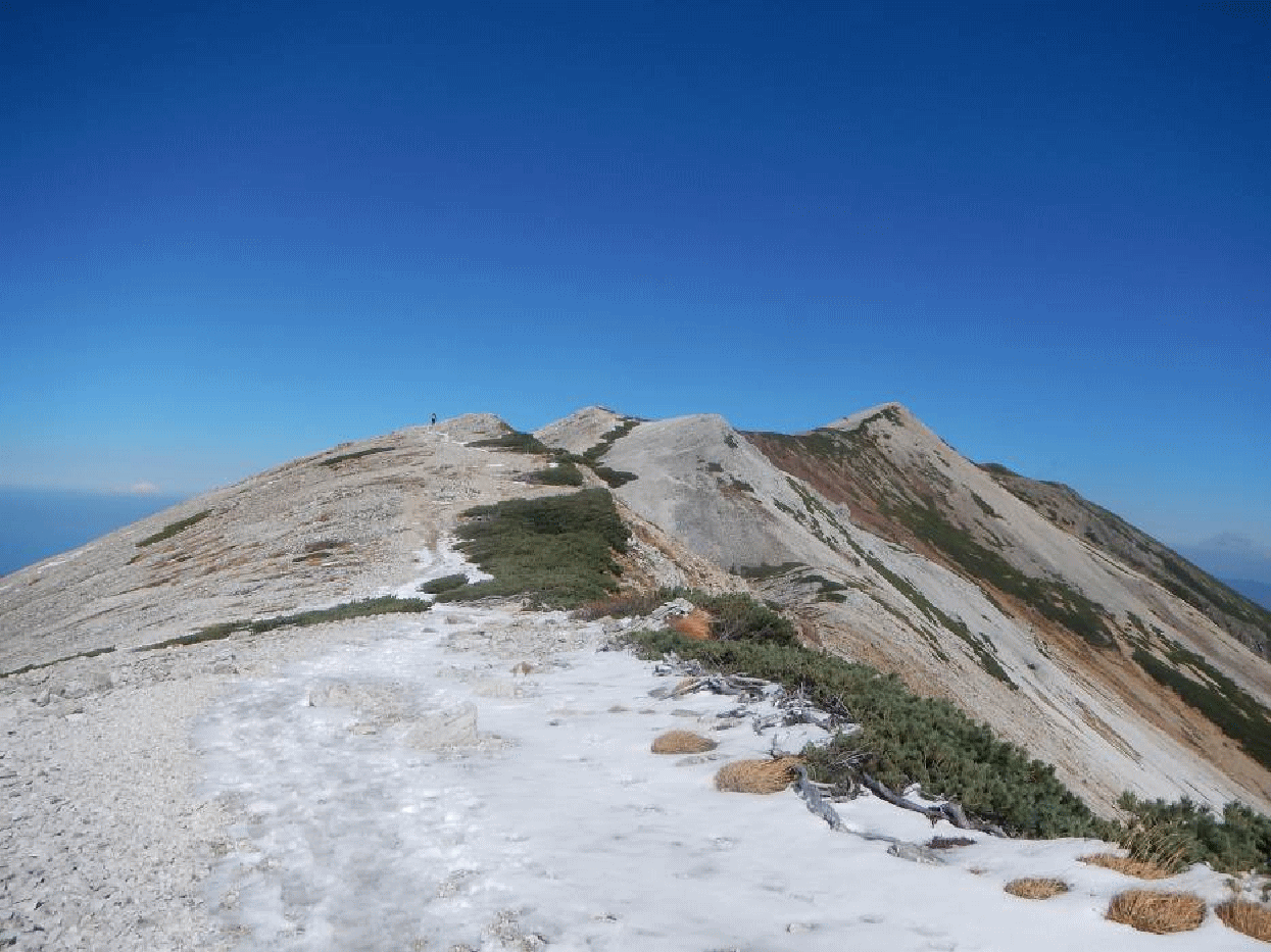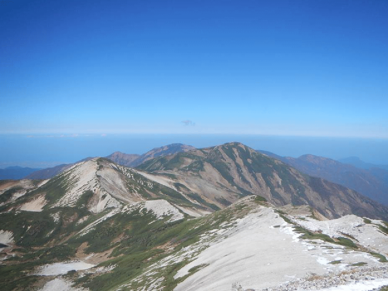 天気は晴れ。朝方の冷え込みは厳しかったし、気温はそれほど上がっていないよう。稜線上の風は冷たい。快晴の山頂からの展望は素晴らしかった。剣岳から立山連峰、槍ヶ岳までがはっきりとわかる。北アルプスの山々の端から端まで見渡せるようだ。夏と違って登山者の行き来も少ない、静かな山頂。雲ひとつない青空、秋の日差しがきらめく中、これ以上ないくらいの素晴らしい光景に見入っていた。