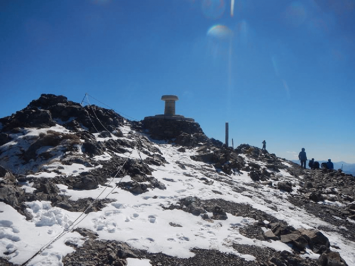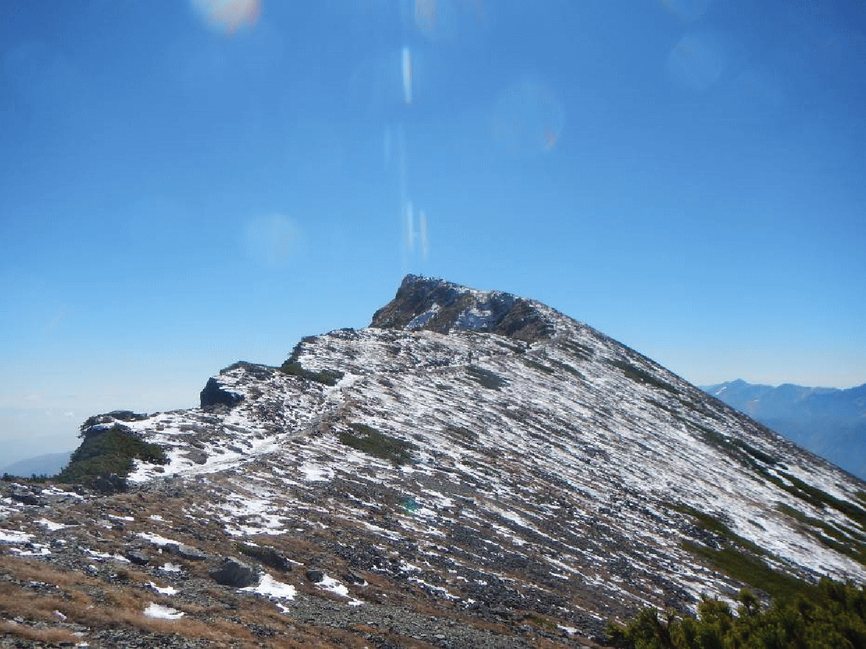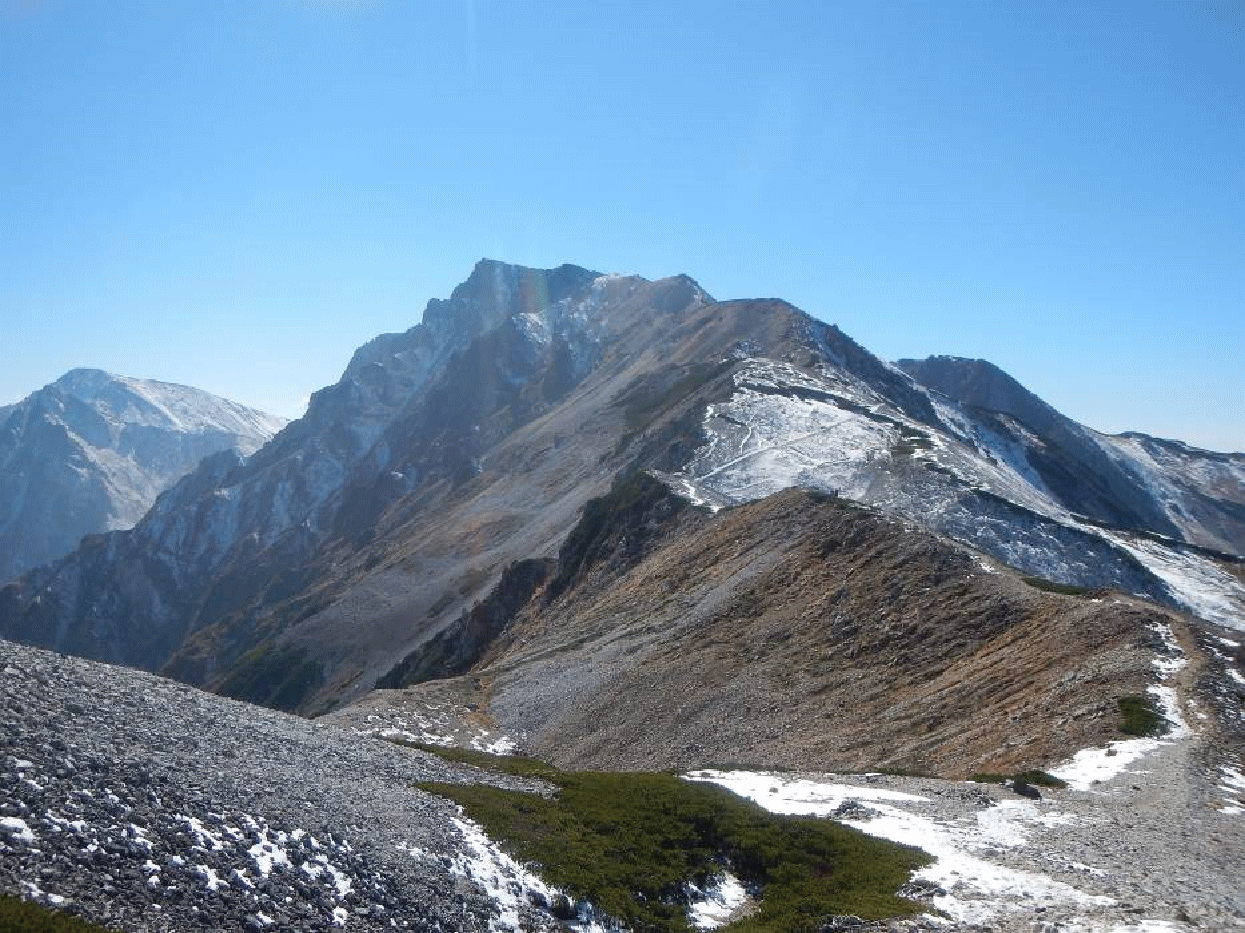 天気は晴れ。朝方の冷え込みは厳しかったし、気温はそれほど上がっていないよう。稜線上の風は冷たい。快晴の山頂からの展望は素晴らしかった。剣岳から立山連峰、槍ヶ岳までがはっきりとわかる。北アルプスの山々の端から端まで見渡せるようだ。夏と違って登山者の行き来も少ない、静かな山頂。雲ひとつない青空、秋の日差しがきらめく中、これ以上ないくらいの素晴らしい光景に見入っていた。