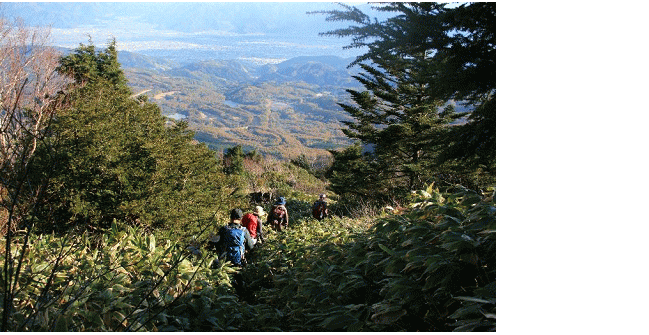 登山道からいったん木材搬出用の作業道に出る。すぐに左の登山道に入らなければならないところ、トップが道標を見落として作業道の終点まで行ってしまい、分岐点に戻るまで1時間近くロスしてしまう。分岐には「⇐ 登山道」と書かれた看板が確かにあった。