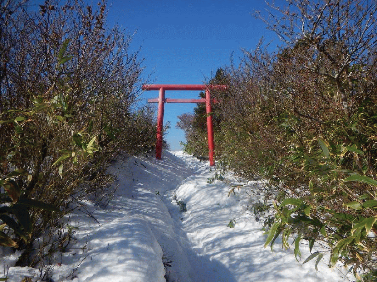 お花畑分岐からは展望の良い尾根歩きとなる。積雪は30センチメートルほど。降ったばかりの新雪は安定していなく歩きにくい。葉山神社の下に広がっている湿原も雪の下で、池塘は半凍結状態。赤い鳥居をくぐると葉山神社があるピークとなった。目の前に大きく広がる月山。大きな大きなピークは白く輝いていた。