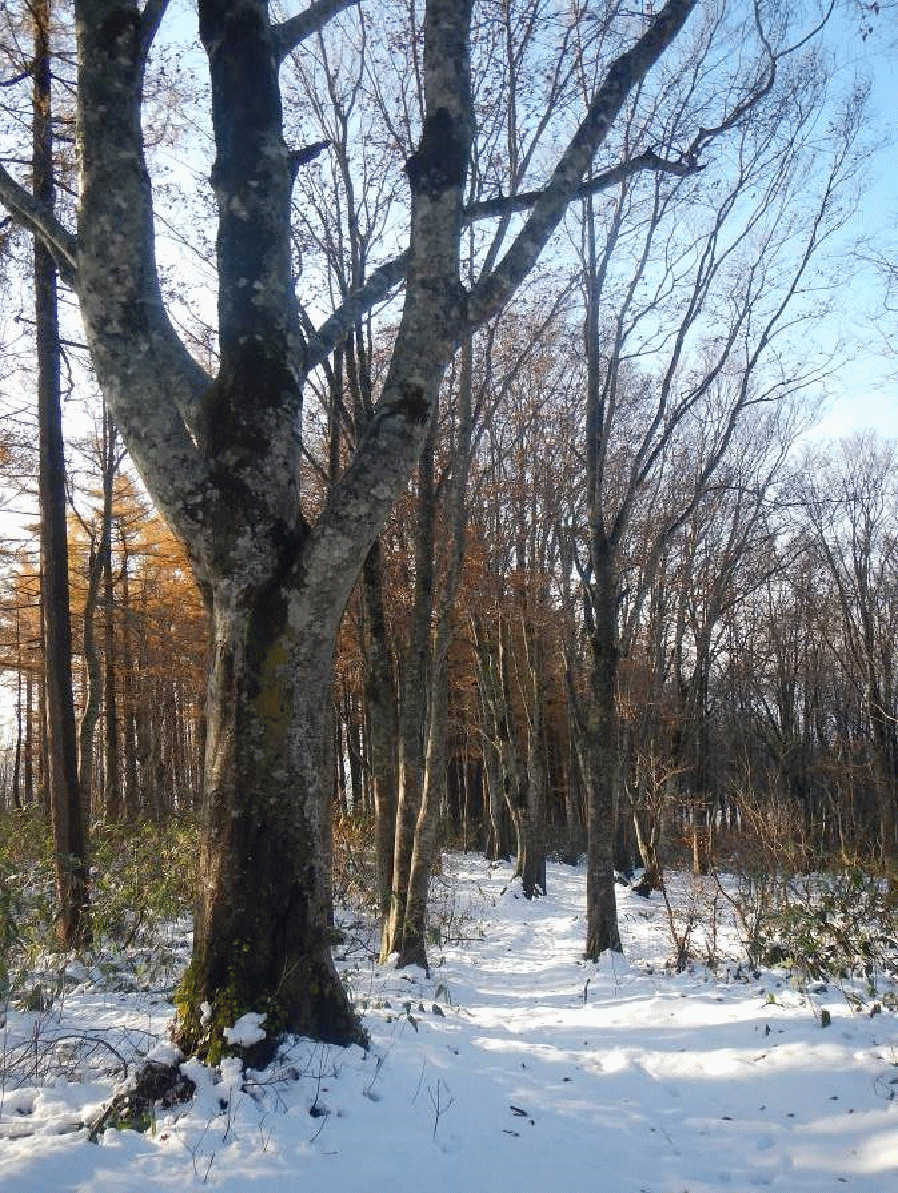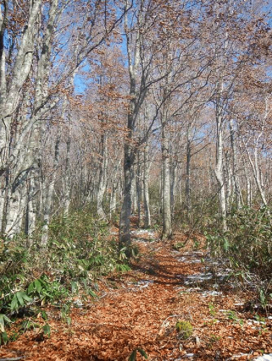 紅葉を楽しみに出かけてみたら、新雪の山登りとなった。登山口から少し入ると雪が出始め、落葉したブナの林も雪で真っ白。標高1461メートルの山形県の山。今の時季、雪があるのは当たり前なのだろうか。途中で雨具のズボンをはくが、長靴の中は雪ですでにびっしょりと濡れてしまっていた。