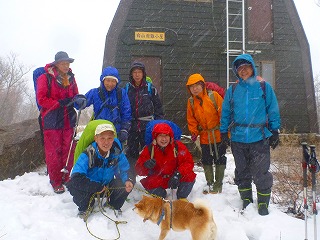 天気も雨から雪に変わってきた。山頂小屋に入り、昼休憩とする。我々の他は誰もいない。2階に、フライシートを張り、今年も鴨鍋うどんをメインに皆が持ち寄った豊富な食材でいつもの豪華な宴会で満腹となりました。