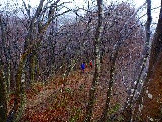恒例のクリスマスの白山山行。この時期、年によって雪の状態が全く違い、大雪で山頂まで行けない時もあれば、無雪期同様な時もある。今年は雪が少なかった昨年よりも更に雪が少なく、周囲の山にも雪の様子が感じられない。天候は良くなかったが、小雨がぱらつく程度で大降りではない。駐車場から8合目まで雪は無く順調に進む。8合目からは少しの雪が出てきて、9合目あたりからはやや歩きにくくなったが、積雪は10~20cm程度。ほどなく山頂小屋に到着。