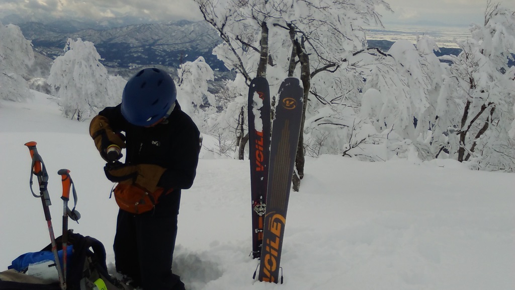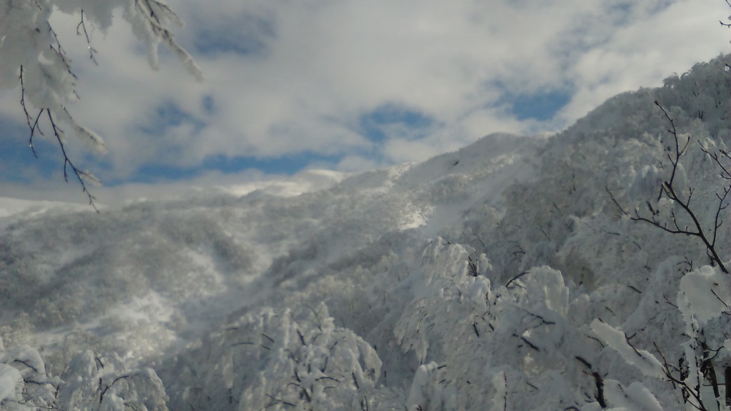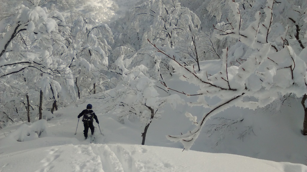 独標へはまだ深いラッセルが続くが若いブナ林は雪の花で美しい。独標の積雪は3m、この先のルート上はブッシュが多くもう一降りの雪がほしい。森林限界の標高1100m付近六合目で12時、ここで退却とする。帰路スキーは気温も上らずパウダースノーを楽しめた。